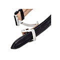 Браслет часов изготовлен из чёрной кожи, что придаёт часам классический и элегантный вид. Застёжка выполнена в виде раскладной застежкиРаскладная застёжкаТакой тип застёжки используется только на браслетах из металла. Она никогда не раскрывается полностью, происходит разделение на 2 и более частей. Раскладывающая застёжка снизит вероятность потери часов к минимуму., которая обеспечивает удобство и надёжную фиксацию на запястье.