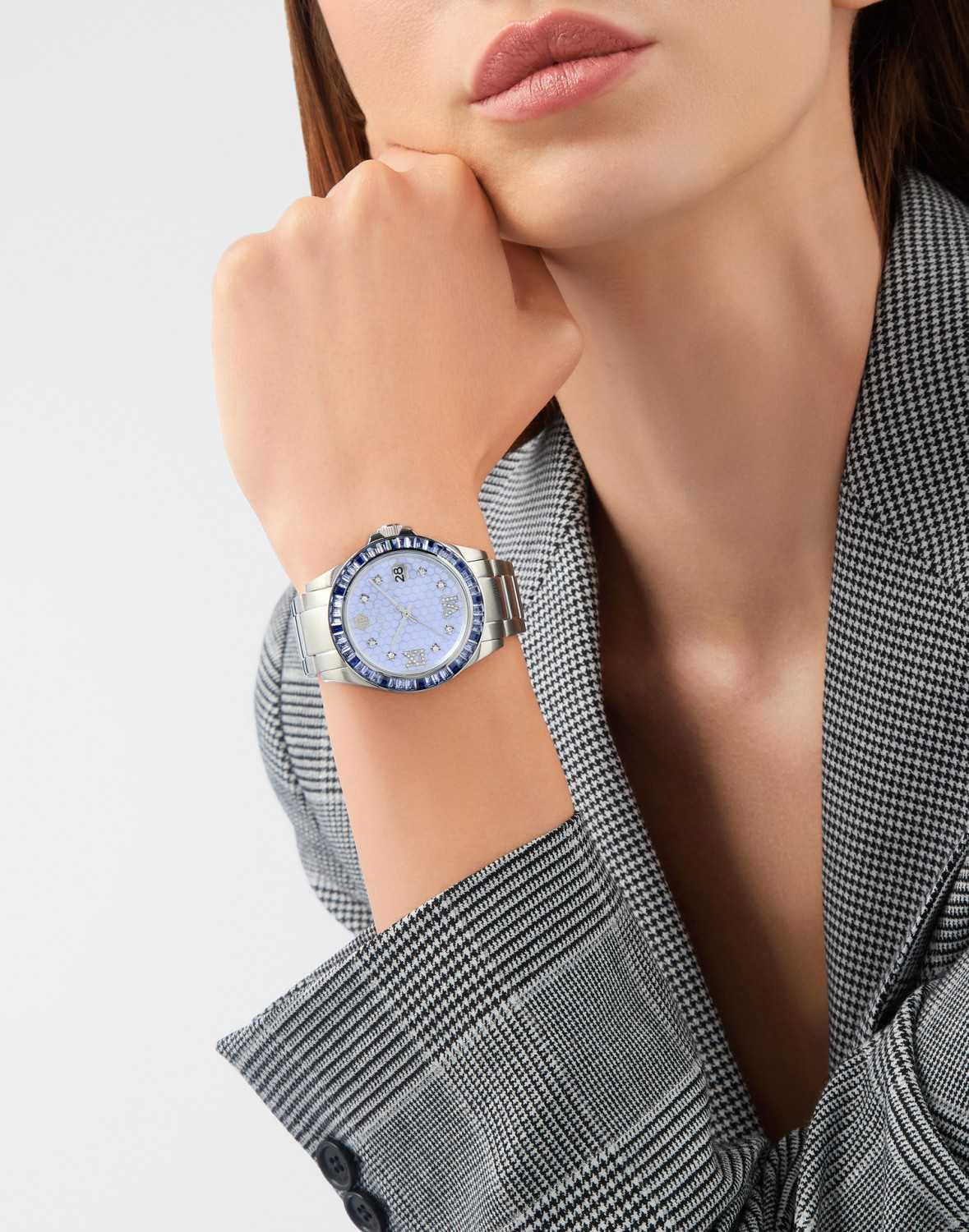 Женские кварцевые часы Philipp Plein Lady Empire PW2FA0125 — это стильное сочетание элегантности и современного дизайна. Изящный корпус выполнен из нержавеющей стали, диаметром 39 мм, что придаст образу женственности и романтизма. Изысканный циферблат с метками в виде точек и римских цифр придает модели особый блеск. Циферблат защищен минеральным стекломМинеральное стеклоМинеральное стекло представляет собой искусственно выращенный минерал кварца. Такое стекло отличается особой устойчивостью к повреждениям и царапинам. Уступает по некоторым качествам сапфировому стеклу., обеспечивающий устойчивость к царапинам и украшен кристаллами. Стрелки с люминесцентным покрытиемЛюминесцентное покрытиеПозволяет считывать показания времени в темноте. Производители наносят на стрелки, часовые индексы, безель или поверхность циферблата светонакопительный состав, дающий холодное свечение.. Окошко даты находится в положении 3 часа. БезельБезельВнешний ободок, закрепляющий стекло. В спортивных часах так называется поворотное кольцо с делениями на циферблате, выполняет роль таймера – замеряет отрезки времени на шкале. Неподвижный безель – элемент декора. Однонаправленно вращающийся безель на дайверских часах позволяет фиксировать моменты погружения и выныривания на поверхность. украшен цирконами. Часы оснащены надежным кварцевым механизмом. Стальной браслет на застёжке-бабочке с кнопкамиЗастёжка "бабочка"Такой вид застёжки дополняется предохранителями, помогающими избежать случайного раскрытия браслета. Обладают изящным исполнением. , гарантирует комфортное и безопасное ношение. Класс водозащиты: 50 метров позволит защитить корпус от случайных брызг или капель дождя. Phlipp Plein — отличный выбор для тех, кто ценит яркость и качество.