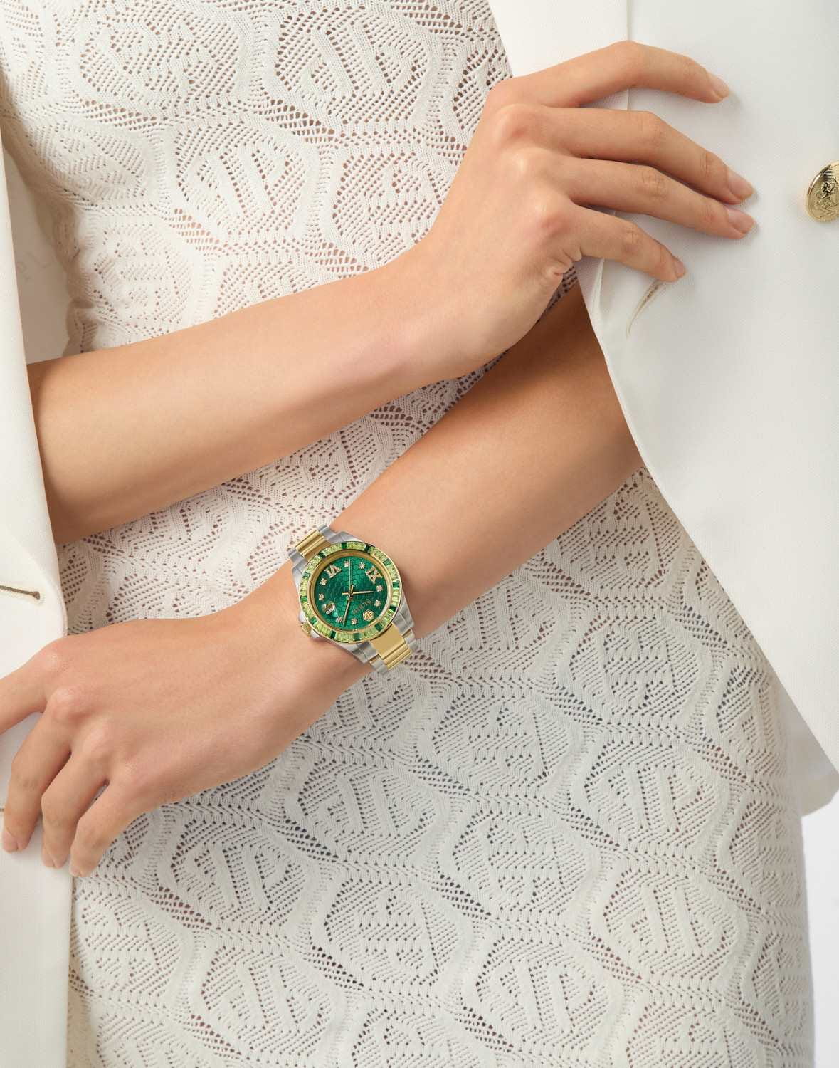Женские кварцевые часы Philipp Plein Lady Empire PW2FA0225 — это стильное сочетание элегантности и современного дизайна. Изящный корпус выполнен из нержавеющей стали, диаметром 39 мм, что придаст образу женственности и романтизма. Изысканный циферблат с метками в виде точек и римских цифр придает модели особый блеск. Циферблат защищен минеральным стекломМинеральное стеклоМинеральное стекло представляет собой искусственно выращенный минерал кварца. Такое стекло отличается особой устойчивостью к повреждениям и царапинам. Уступает по некоторым качествам сапфировому стеклу., обеспечивающий устойчивость к царапинам и украшен кристаллами. Стрелки с люминесцентным покрытиемЛюминесцентное покрытиеПозволяет считывать показания времени в темноте. Производители наносят на стрелки, часовые индексы, безель или поверхность циферблата светонакопительный состав, дающий холодное свечение.. Окошко даты находится в положении 3 часа. БезельБезельВнешний ободок, закрепляющий стекло. В спортивных часах так называется поворотное кольцо с делениями на циферблате, выполняет роль таймера – замеряет отрезки времени на шкале. Неподвижный безель – элемент декора. Однонаправленно вращающийся безель на дайверских часах позволяет фиксировать моменты погружения и выныривания на поверхность. с PVD-покрытиемPVDУльтратонкое покрытие наносится в технике вакуумного напыления, сочетает в себе нитрид титана особой прочности со слоем золота или оксида хрома. Несёт в себе декоративную или защитную функцию. украшен цирконами. Часы оснащены надежным кварцевым механизмом. Стальной браслет с частичным PVD-покрытиемPVDУльтратонкое покрытие наносится в технике вакуумного напыления, сочетает в себе нитрид титана особой прочности со слоем золота или оксида хрома. Несёт в себе декоративную или защитную функцию. на застёжке-бабочке с кнопкамиЗастёжка "бабочка"Такой вид застёжки дополняется предохранителями, помогающими избежать случайного раскрытия браслета. Обладают изящным исполнением. , гарантирует комфортное и безопасное ношение. Класс водозащиты: 50 метров позволит защитить корпус от случайных брызг или капель дождя. Phlipp Plein — отличный выбор для тех, кто ценит яркость и качество.