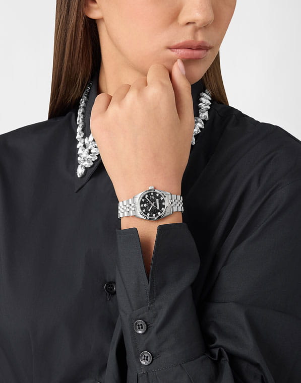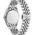 Philipp Plein DATE SUPERLATIVE PWNFA0125 - дерзкое заявление любви к роскоши и бунтарскому стилю. Диаметр круглого корпуса из прочной нержавеющей стали равен 28 мм. Стальной браслет на застёжке «бабочка» с кнопкамиЗастёжка "бабочка"Такой вид застёжки дополняется предохранителями, помогающими избежать случайного раскрытия браслета. Обладают изящным исполнением. обеспечивает надёжную фиксацию и комфортное ношение. Метки в виде кристаллов Preciosa. Минеральное стеклоМинеральное стеклоМинеральное стекло представляет собой искусственно выращенный минерал кварца. Такое стекло отличается особой устойчивостью к повреждениям и царапинам. Уступает по некоторым качествам сапфировому стеклу. защищает циферблат от царапин. Люминесцентное покрытиеЛюминесцентное покрытиеПозволяет считывать показания времени в темноте. Производители наносят на стрелки, часовые индексы, безель или поверхность циферблата светонакопительный состав, дающий холодное свечение. стрелок и меток позволит следить за временем даже в полной темноте. Граненая заводная головка. Влагозащита: 50 метров, позволит защитить корпус от случайных брызг или капель дождя. Идеальный аксессуар для тех, кто ценит индивидуальность и не боится выделяться из толпы.
