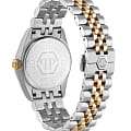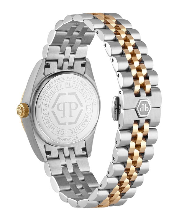 Philipp Plein DATE SUPERLATIVE PWNFA0325 - дерзкое заявление любви к роскоши и бунтарскому стилю. Диаметр круглого корпуса из прочной нержавеющей стали равен 28 мм. Стальной браслет на застёжке «бабочка» с кнопкамиЗастёжка "бабочка"Такой вид застёжки дополняется предохранителями, помогающими избежать случайного раскрытия браслета. Обладают изящным исполнением. обеспечивает надёжную фиксацию и комфортное ношение. Метки в виде кристаллов Preciosa. Минеральное стеклоМинеральное стеклоМинеральное стекло представляет собой искусственно выращенный минерал кварца. Такое стекло отличается особой устойчивостью к повреждениям и царапинам. Уступает по некоторым качествам сапфировому стеклу. защищает циферблат от царапин. Люминесцентное покрытиеЛюминесцентное покрытиеПозволяет считывать показания времени в темноте. Производители наносят на стрелки, часовые индексы, безель или поверхность циферблата светонакопительный состав, дающий холодное свечение. стрелок и меток позволит следить за временем даже в полной темноте. БезельБезельВнешний ободок, закрепляющий стекло. В спортивных часах так называется поворотное кольцо с делениями на циферблате, выполняет роль таймера – замеряет отрезки времени на шкале. Неподвижный безель – элемент декора. Однонаправленно вращающийся безель на дайверских часах позволяет фиксировать моменты погружения и выныривания на поверхность. с PVD-покрытиемPVDУльтратонкое покрытие наносится в технике вакуумного напыления, сочетает в себе нитрид титана особой прочности со слоем золота или оксида хрома. Несёт в себе декоративную или защитную функцию.. Граненая заводная головка. Влагозащита: 50 метров, позволит защитить корпус от случайных брызг или капель дождя. Идеальный аксессуар для тех, кто ценит индивидуальность и не боится выделяться из толпы.