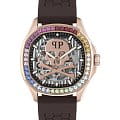 Яркие мужские часы с минеральным стекломМинеральное стеклоМинеральное стекло представляет собой искусственно выращенный минерал кварца. Такое стекло отличается особой устойчивостью к повреждениям и царапинам. Уступает по некоторым качествам сапфировому стеклу. Philipp Plein PWRAA0623, механический механизм. Класс водозащиты: 50 метров, позволит защитить корпус от случайных брызг или капель дождя. Корпус часов изготовлен из стали и украшен кристаллами. Стрелки и метки с люминесцентным покрытиемЛюминесцентное покрытиеПозволяет считывать показания времени в темноте. Производители наносят на стрелки, часовые индексы, безель или поверхность циферблата светонакопительный состав, дающий холодное свечение.. Скелетонизированные. Часы с механизмом, из которого удалён весь «лишний» металл, с прозрачными циферблатом и задней крышкой,