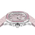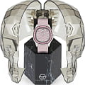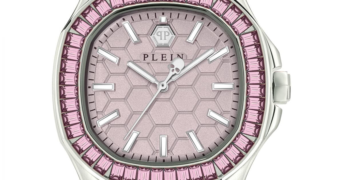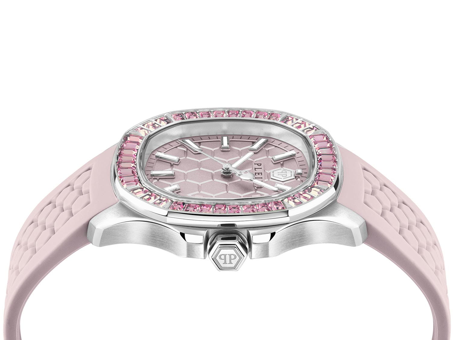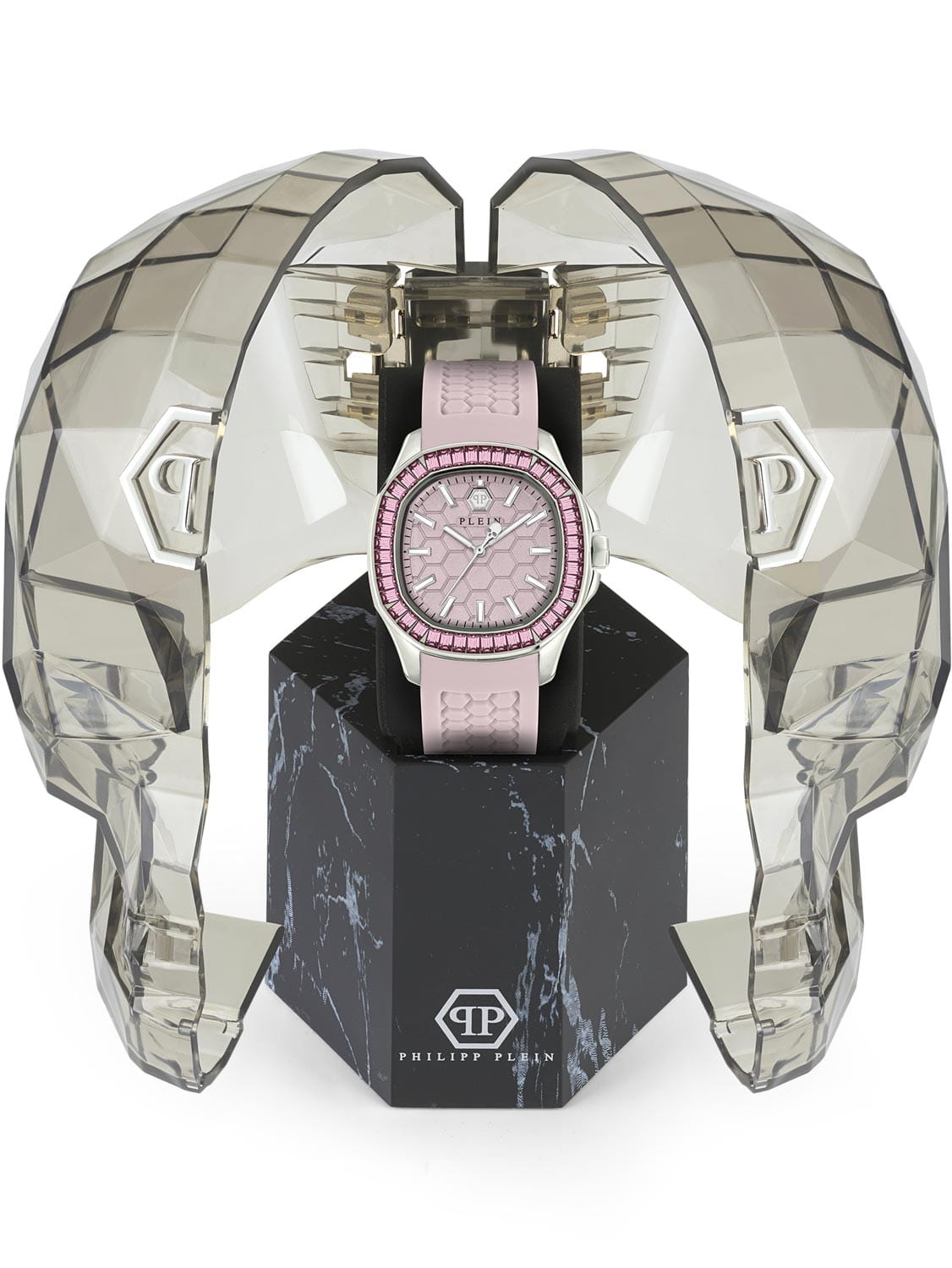 Кварцевые женские часы с минеральным стекломМинеральное стеклоМинеральное стекло представляет собой искусственно выращенный минерал кварца. Такое стекло отличается особой устойчивостью к повреждениям и царапинам. Уступает по некоторым качествам сапфировому стеклу. Philipp Plein Plein Philipp PWTAA0123, кварцевый механизм с высокой точностью. Класс водозащиты: 50 метров, позволит защитить корпус от случайных брызг или капель дождя. Корпус часов изготовлен из стали. Стрелки и метки с люминесцентным покрытиемЛюминесцентное покрытиеПозволяет считывать показания времени в темноте. Производители наносят на стрелки, часовые индексы, безель или поверхность циферблата светонакопительный состав, дающий холодное свечение.. Стальной корпус с геометричным безелемБезельВнешний ободок, закрепляющий стекло. В спортивных часах так называется поворотное кольцо с делениями на циферблате, выполняет роль таймера – замеряет отрезки времени на шкале. Неподвижный безель – элемент декора. Однонаправленно вращающийся безель на дайверских часах позволяет фиксировать моменты погружения и выныривания на поверхность., инкрустированным кристаллами. Силиконовый ремешок с шестиугольным рисунком на стандартной застёжке, украшенной черепом.