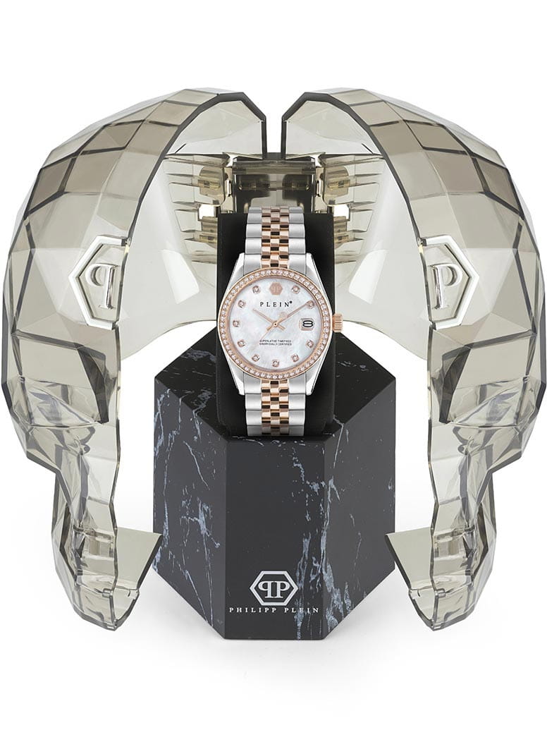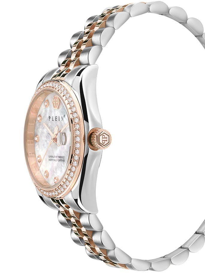 Яркие женские часы Philipp Plein Date Superlative PWYAA0223 c с минеральным стекломМинеральное стеклоМинеральное стекло представляет собой искусственно выращенный минерал кварца. Такое стекло отличается особой устойчивостью к повреждениям и царапинам. Уступает по некоторым качествам сапфировому стеклу.. Особенные часы для особенных женщин! Ослепительный аксессуар, демонстрирующий роскошь и изысканность.Часы с круглым стальным корпусом с IP-покрытиемIP-покрытиеМетод ионного напыления. Демонстрирует повышенную устойчивость к истиранию, окислению и химическим веществам. Под воздействием высокого давления и температуры около 1500°C молекулы металла надёжно соединяются с частицами корпуса часов.. Перламутровый циферблат с метками в виде точек, украшенных кристаллами. Люминесцентное покрытиеЛюминесцентное покрытиеПозволяет считывать показания времени в темноте. Производители наносят на стрелки, часовые индексы, безель или поверхность циферблата светонакопительный состав, дающий холодное свечение. стрелок. Окошко даты с увеличительным стеклом находится в положении 3 часа. Рифленая заводная головка. Стальной браслет на застёжке бабочка с кнопкамиЗастёжка "бабочка"Такой вид застёжки дополняется предохранителями, помогающими избежать случайного раскрытия браслета. Обладают изящным исполнением.