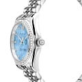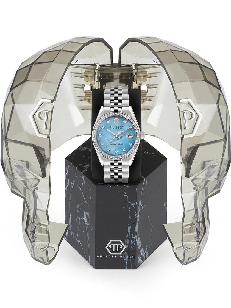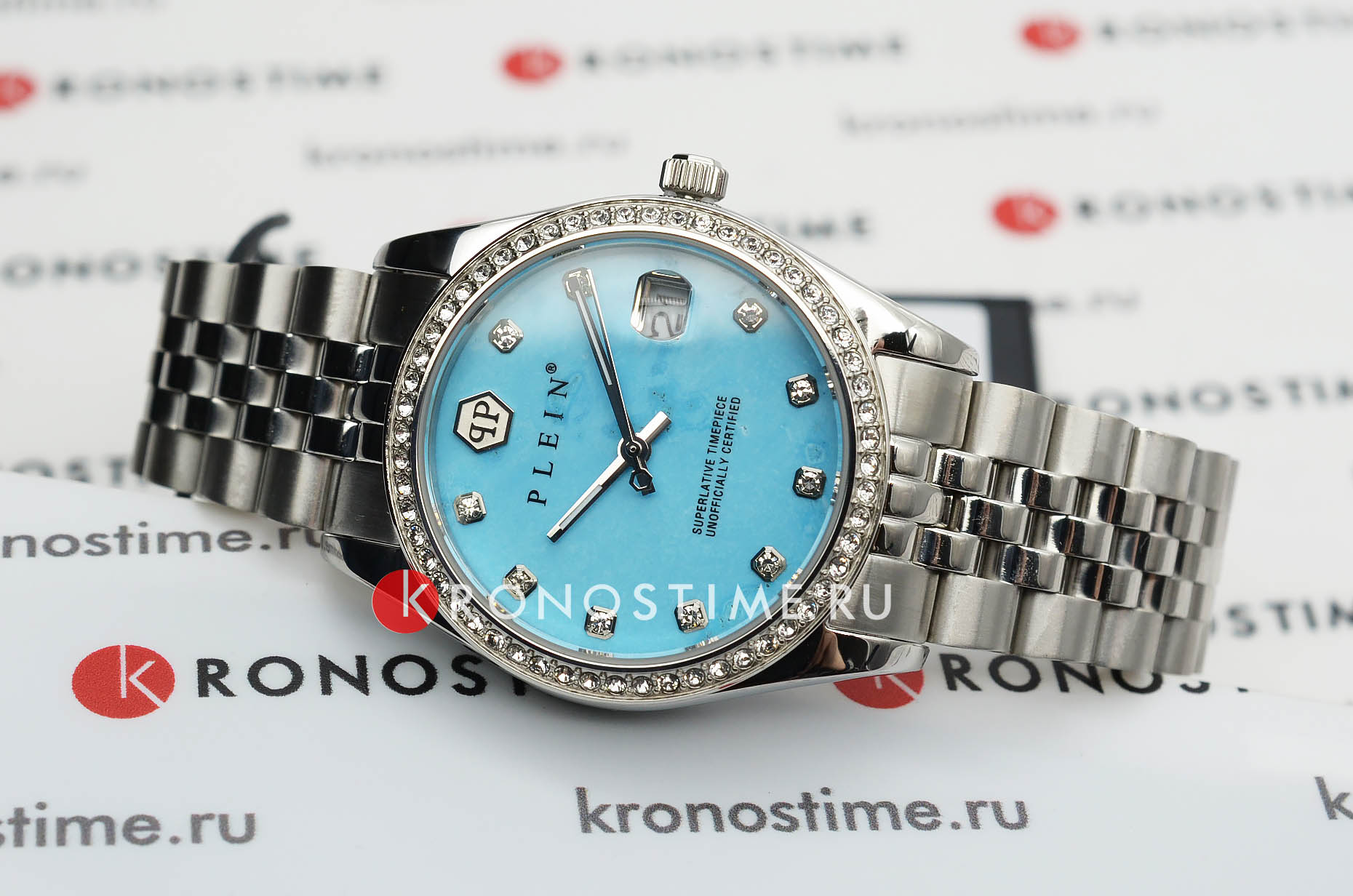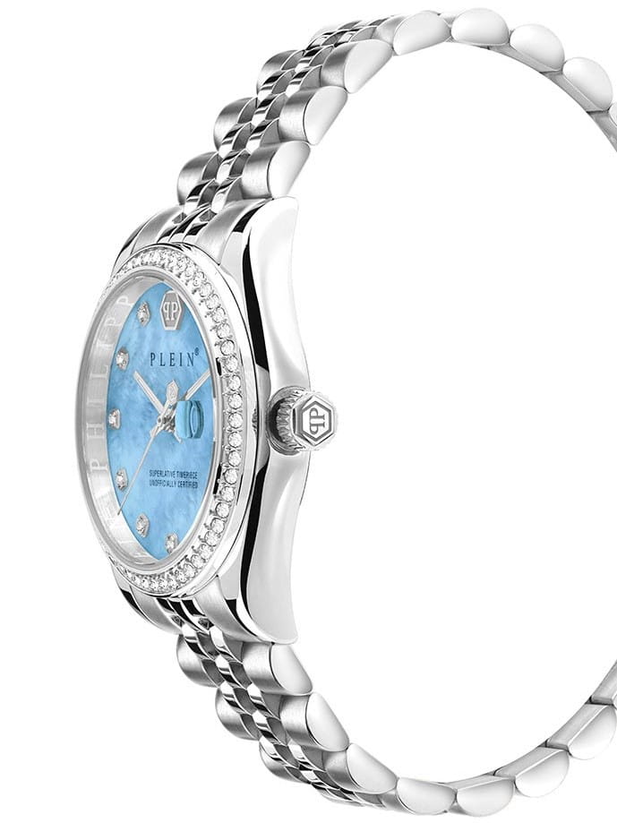 Яркие женские часы Philipp Plein Date Superlative PWYAA0423 c с минеральным стекломМинеральное стеклоМинеральное стекло представляет собой искусственно выращенный минерал кварца. Такое стекло отличается особой устойчивостью к повреждениям и царапинам. Уступает по некоторым качествам сапфировому стеклу.. Особенные часы для особенных женщин! Ослепительный аксессуар, демонстрирующий роскошь и изысканность.Часы с круглым стальным корпусом. Перламутровый циферблат с метками в виде точек, украшенных кристаллами. Люминесцентное покрытиеЛюминесцентное покрытиеПозволяет считывать показания времени в темноте. Производители наносят на стрелки, часовые индексы, безель или поверхность циферблата светонакопительный состав, дающий холодное свечение. стрелок. Окошко даты с увеличительным стеклом находится в положении 3 часа. Рифленая заводная головка. Стальной браслет на застёжке бабочка с кнопкамиЗастёжка "бабочка"Такой вид застёжки дополняется предохранителями, помогающими избежать случайного раскрытия браслета. Обладают изящным исполнением.