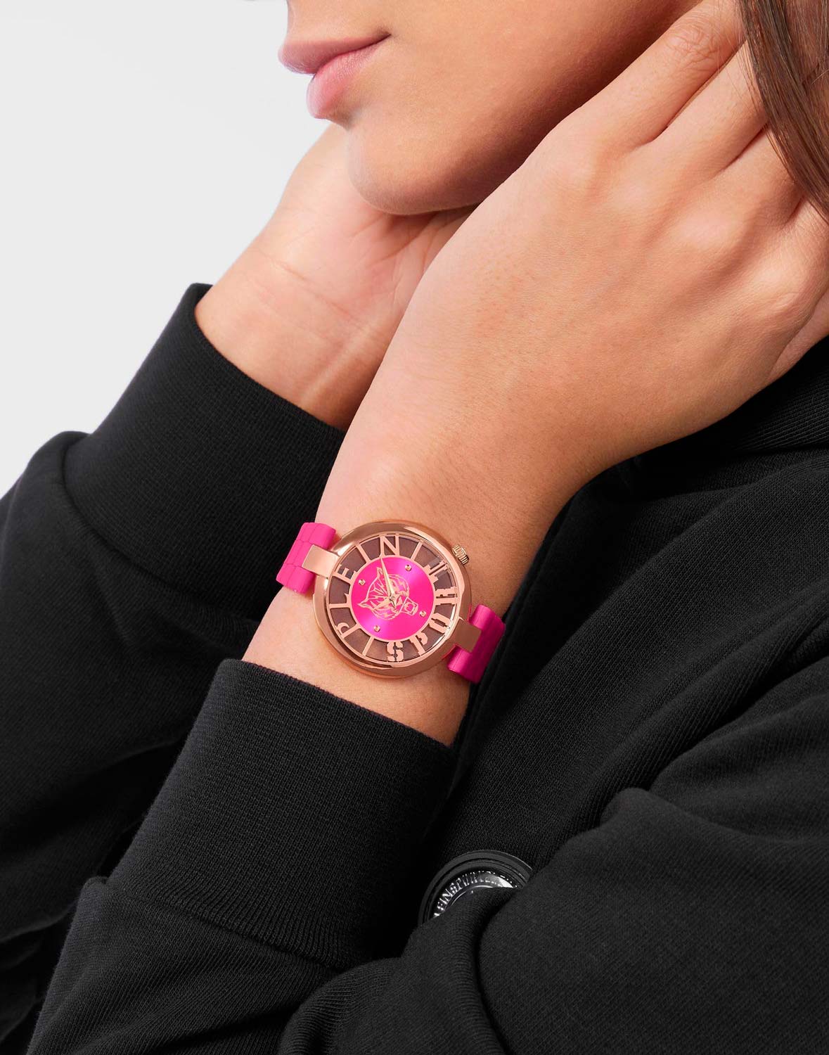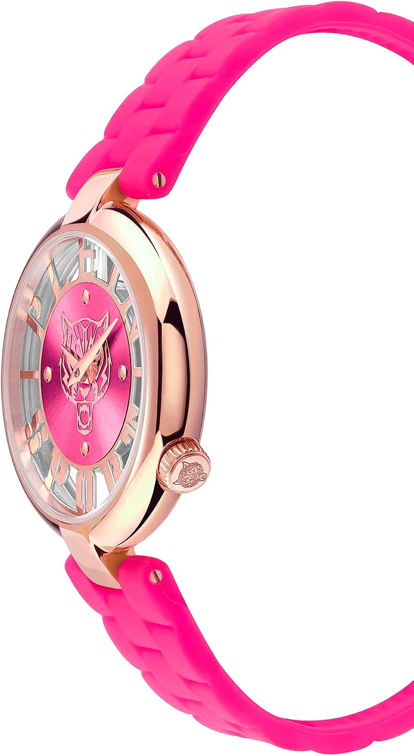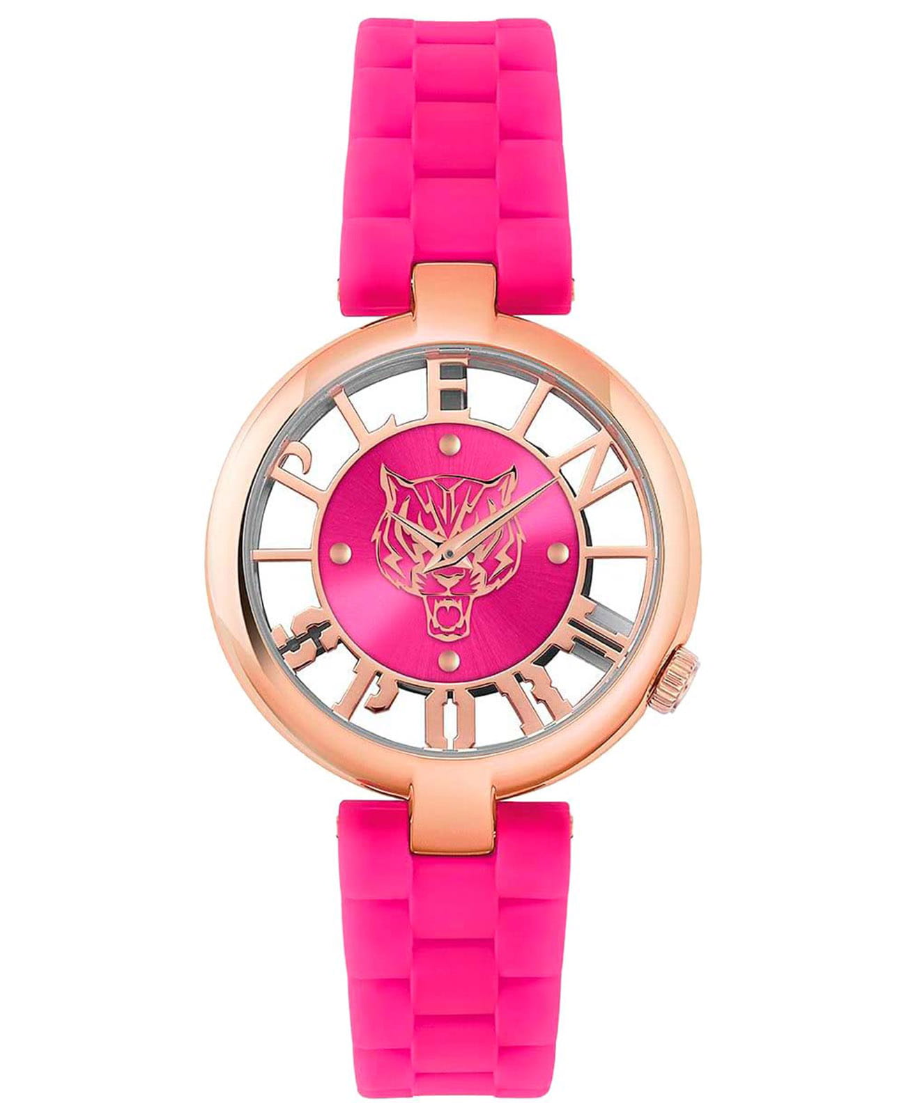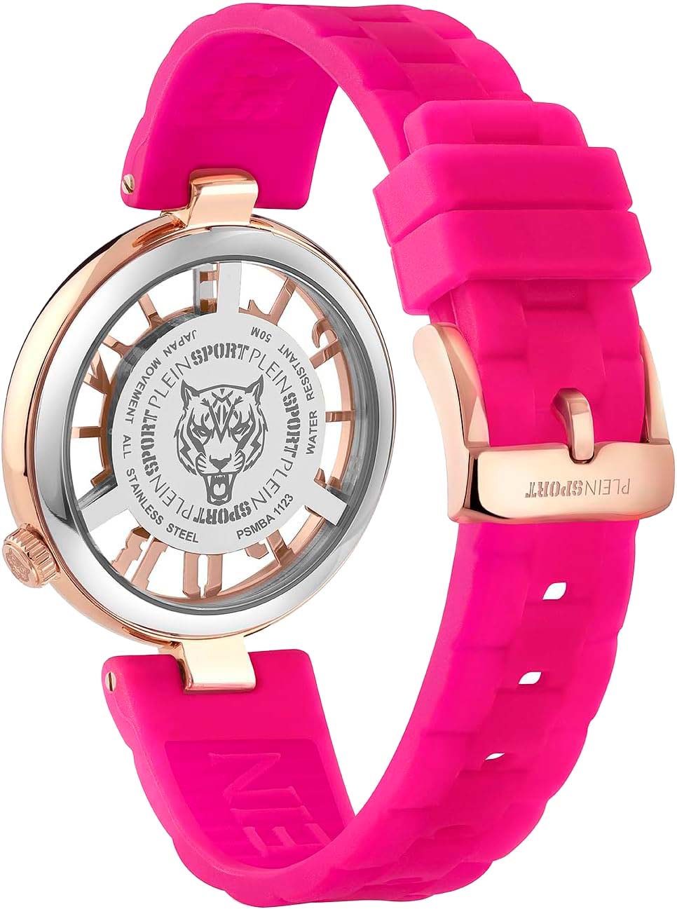 Немецкие женские кварцевые часы с минеральным стекломМинеральное стеклоМинеральное стекло представляет собой искусственно выращенный минерал кварца. Такое стекло отличается особой устойчивостью к повреждениям и царапинам. Уступает по некоторым качествам сапфировому стеклу. Plein Sport Tiger Luxe PSMBA1123, кварцевый механизм с высокой точностью. Класс водозащиты: 50 метров, позволит защитить корпус от случайных брызг или капель дождя. Корпус часов изготовлен из стали  с IP-покрытиемIP-покрытиеМетод ионного напыления. Демонстрирует повышенную устойчивость к истиранию, окислению и химическим веществам. Под воздействием высокого давления и температуры около 1500°C молекулы металла надёжно соединяются с частицами корпуса часов.. Силиконовый ремень на стандартной застёжке.