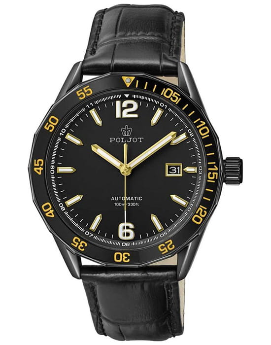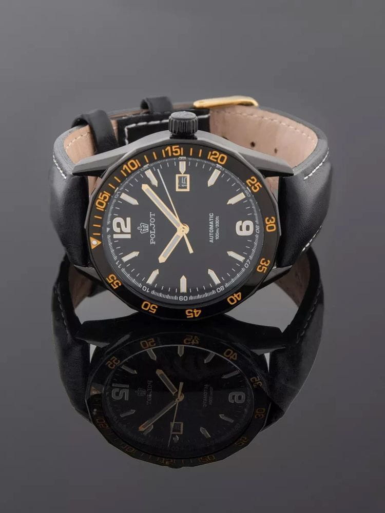 Poljot NH35A.184265 — надёжные механические мужские часы с автоподзаводом, сочетающие техническую точность и выразительный спортивный стиль. Корпус из нержавеющей стали с PVD-покрытиемPVDУльтратонкое покрытие наносится в технике вакуумного напыления, сочетает в себе нитрид титана особой прочности со слоем золота или оксида хрома. Несёт в себе декоративную или защитную функцию. подчёркивает прочность конструкции, а насыщенный циферблат с акцентами на стрелках и метках придаёт модели динамичный и современный облик. БезельБезельВнешний ободок, закрепляющий стекло. В спортивных часах так называется поворотное кольцо с делениями на циферблате, выполняет роль таймера – замеряет отрезки времени на шкале. Неподвижный безель – элемент декора. Однонаправленно вращающийся безель на дайверских часах позволяет фиксировать моменты погружения и выныривания на поверхность. с PVD-покрытиемPVDУльтратонкое покрытие наносится в технике вакуумного напыления, сочетает в себе нитрид титана особой прочности со слоем золота или оксида хрома. Несёт в себе декоративную или защитную функцию.. Внутри установлен проверенный японский механизм SEIKO NH35, обеспечивающий стабильную работу и плавный ход секундной стрелки. Окно даты добавляет функциональности, а широкие метки с люминесцентным покрытиемЛюминесцентное покрытиеПозволяет считывать показания времени в темноте. Производители наносят на стрелки, часовые индексы, безель или поверхность циферблата светонакопительный состав, дающий холодное свечение. обеспечивают отличную читаемость даже в темноте. Прочное минеральное стеклоМинеральное стеклоМинеральное стекло представляет собой искусственно выращенный минерал кварца. Такое стекло отличается особой устойчивостью к повреждениям и царапинам. Уступает по некоторым качествам сапфировому стеклу. защищает циферблат от царапин, а ремешок из натуральной кожи с контрастной прострочкой гарантирует комфорт и надёжную посадку. Poljot — часы с характером, созданные для тех, кто ценит точность, качество и спортивную уверенность в каждой детали.