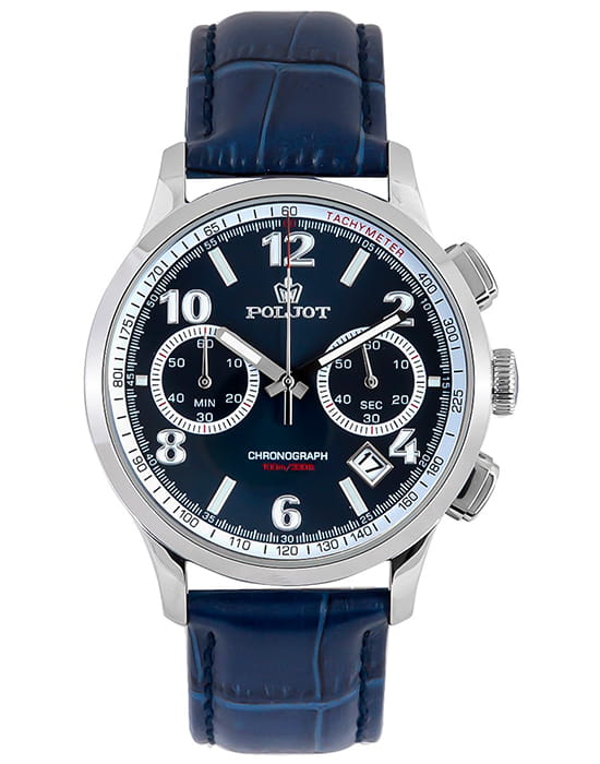 Poljot 6S21.901214 — современные мужские часы с выразительным спортивным дизайном и надёжной функциональностью. Корпус из нержавеющей стали подчёркивает прочность и уверенный характер модели, а глубокий циферблат с счётчиками хронографаХронографФункция позволяет измерять отрезки времени с особой точностью: часы, минуты, секунды. Верным признаком хронографа является наличие на циферблате 3 дополнительных окошек-счётчиков. и аккуратным окном даты придаёт часам динамичный вид. Контрастные стрелки и метки с люминесцентным покрытиемЛюминесцентное покрытиеПозволяет считывать показания времени в темноте. Производители наносят на стрелки, часовые индексы, безель или поверхность циферблата светонакопительный состав, дающий холодное свечение. обеспечивают удобство считывания информации в любое время суток, а внешняя шкала тахиметраТахиметрРазмеченная шкала, располагается на ободке или безеле часов. Тахиметр позволяет рассчитать скорость на определённом участке пути, расстояние измеряется в километрах или милях. добавляет спортивную функциональность. Прочное минеральное стеклоМинеральное стеклоМинеральное стекло представляет собой искусственно выращенный минерал кварца. Такое стекло отличается особой устойчивостью к повреждениям и царапинам. Уступает по некоторым качествам сапфировому стеклу. защищает циферблат от царапин, а ремешок из натуральной кожи гарантирует комфорт и элегантную посадку на запястье. Poljot — это гармония классики и спортивного духа, созданная для мужчин, ценящих точность, надёжность и уверенный стиль.