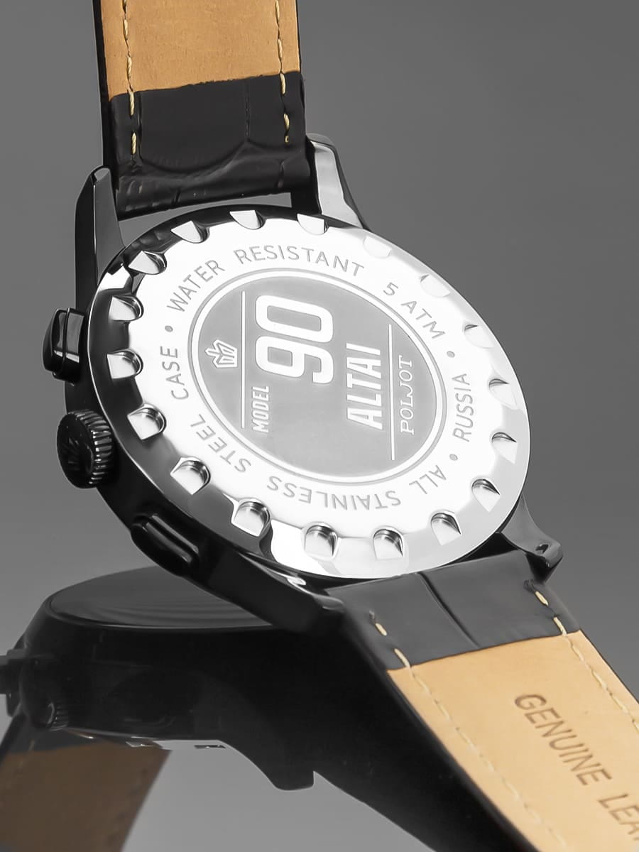 Poljot 6S21.904216 — современные мужские часы с выразительным спортивным дизайном и надёжной функциональностью. Корпус из нержавеющей стали с с PVD-покрытиемPVDУльтратонкое покрытие наносится в технике вакуумного напыления, сочетает в себе нитрид титана особой прочности со слоем золота или оксида хрома. Несёт в себе декоративную или защитную функцию. подчёркивает прочность и уверенный характер модели, а глубокий циферблат с счётчиками хронографаХронографФункция позволяет измерять отрезки времени с особой точностью: часы, минуты, секунды. Верным признаком хронографа является наличие на циферблате 3 дополнительных окошек-счётчиков. и аккуратным окном даты придаёт часам динамичный вид. Контрастные стрелки и метки с люминесцентным покрытиемЛюминесцентное покрытиеПозволяет считывать показания времени в темноте. Производители наносят на стрелки, часовые индексы, безель или поверхность циферблата светонакопительный состав, дающий холодное свечение. обеспечивают удобство считывания информации в любое время суток, а внешняя шкала тахиметраТахиметрРазмеченная шкала, располагается на ободке или безеле часов. Тахиметр позволяет рассчитать скорость на определённом участке пути, расстояние измеряется в километрах или милях. добавляет спортивную функциональность. Прочное минеральное стеклоМинеральное стеклоМинеральное стекло представляет собой искусственно выращенный минерал кварца. Такое стекло отличается особой устойчивостью к повреждениям и царапинам. Уступает по некоторым качествам сапфировому стеклу. защищает циферблат от царапин, а ремешок из натуральной кожи гарантирует комфорт и элегантную посадку на запястье. Poljot — это гармония классики и спортивного духа, созданная для мужчин, ценящих точность, надёжность и уверенный стиль.