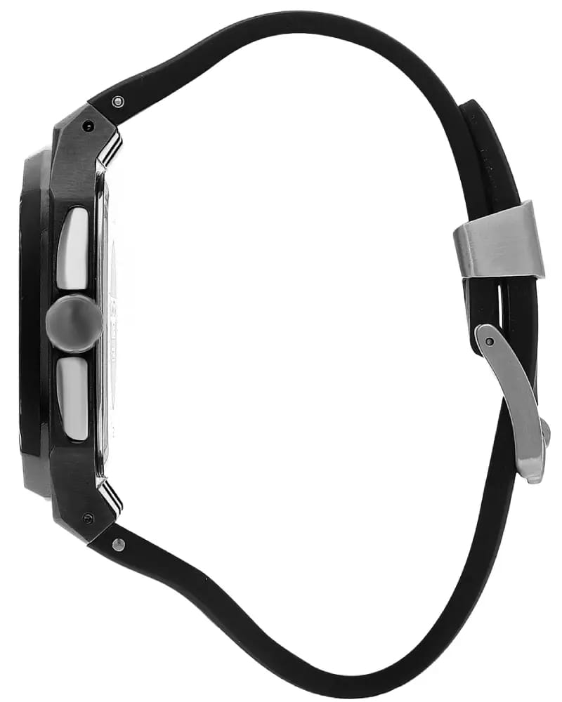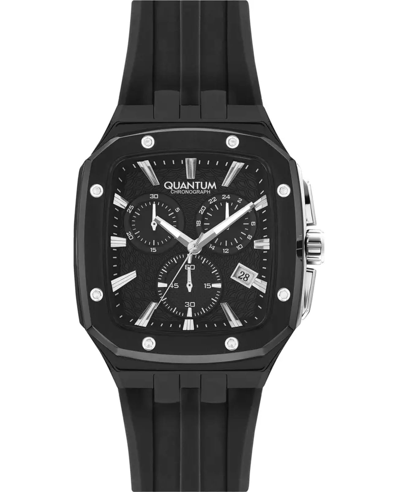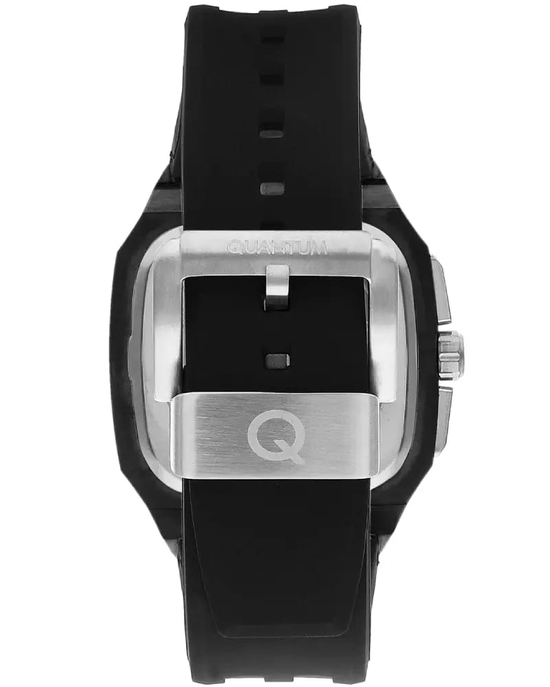Мужские кварцевые часы Quantum из коллекции Hunter — строгий прямоугольный корпус размером 44 мм из нержавеющей стали с PVD-покрытиемPVDУльтратонкое покрытие наносится в технике вакуумного напыления, сочетает в себе нитрид титана особой прочности со слоем золота или оксида хрома. Несёт в себе декоративную или защитную функцию. чёрного цвета и монохромный циферблат с функциями хронографаХронографФункция позволяет измерять отрезки времени с особой точностью: часы, минуты, секунды. Верным признаком хронографа является наличие на циферблате 3 дополнительных окошек-счётчиков. и окошком даты. Стекло — минеральноеМинеральное стеклоМинеральное стекло представляет собой искусственно выращенный минерал кварца. Такое стекло отличается особой устойчивостью к повреждениям и царапинам. Уступает по некоторым качествам сапфировому стеклу. с антибликовым покрытием. Механизм — японский кварцевый Seiko. Водонепроницаемость 100 м. Ремешок — чёрный силиконовый на стандартной застёжке. Идеальный выбор для тех, кто ценит турецкий дизайн и лаконичный спортивный стиль.
