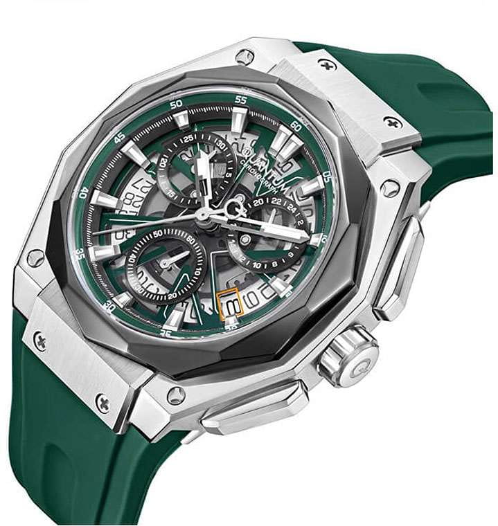 Мужские кварцевые часы Quantum HNG1097.356 из коллекции Hunter — круглый корпус размером 47 мм из нержавеющей стали, оснащённый функциями хронографаХронографФункция позволяет измерять отрезки времени с особой точностью: часы, минуты, секунды. Верным признаком хронографа является наличие на циферблате 3 дополнительных окошек-счётчиков. и окошком даты. БезельБезельВнешний ободок, закрепляющий стекло. В спортивных часах так называется поворотное кольцо с делениями на циферблате, выполняет роль таймера – замеряет отрезки времени на шкале. Неподвижный безель – элемент декора. Однонаправленно вращающийся безель на дайверских часах позволяет фиксировать моменты погружения и выныривания на поверхность. из нержавеющей стали с PVD-покрытиемPVDУльтратонкое покрытие наносится в технике вакуумного напыления, сочетает в себе нитрид титана особой прочности со слоем золота или оксида хрома. Несёт в себе декоративную или защитную функцию.. Стекло — минеральноеМинеральное стеклоМинеральное стекло представляет собой искусственно выращенный минерал кварца. Такое стекло отличается особой устойчивостью к повреждениям и царапинам. Уступает по некоторым качествам сапфировому стеклу. с антибликовым покрытием. Стрелки и метки с люминесцентным покрытиемЛюминесцентное покрытиеПозволяет считывать показания времени в темноте. Производители наносят на стрелки, часовые индексы, безель или поверхность циферблата светонакопительный состав, дающий холодное свечение.. Механизм — японский кварцевый Seiko. Водонепроницаемость 100 м. Ремешок — зелёный силиконовый на стандартной застёжке. Идеальный выбор для тех, кто ценит турецкий дизайн и функциональный спортивный стиль.