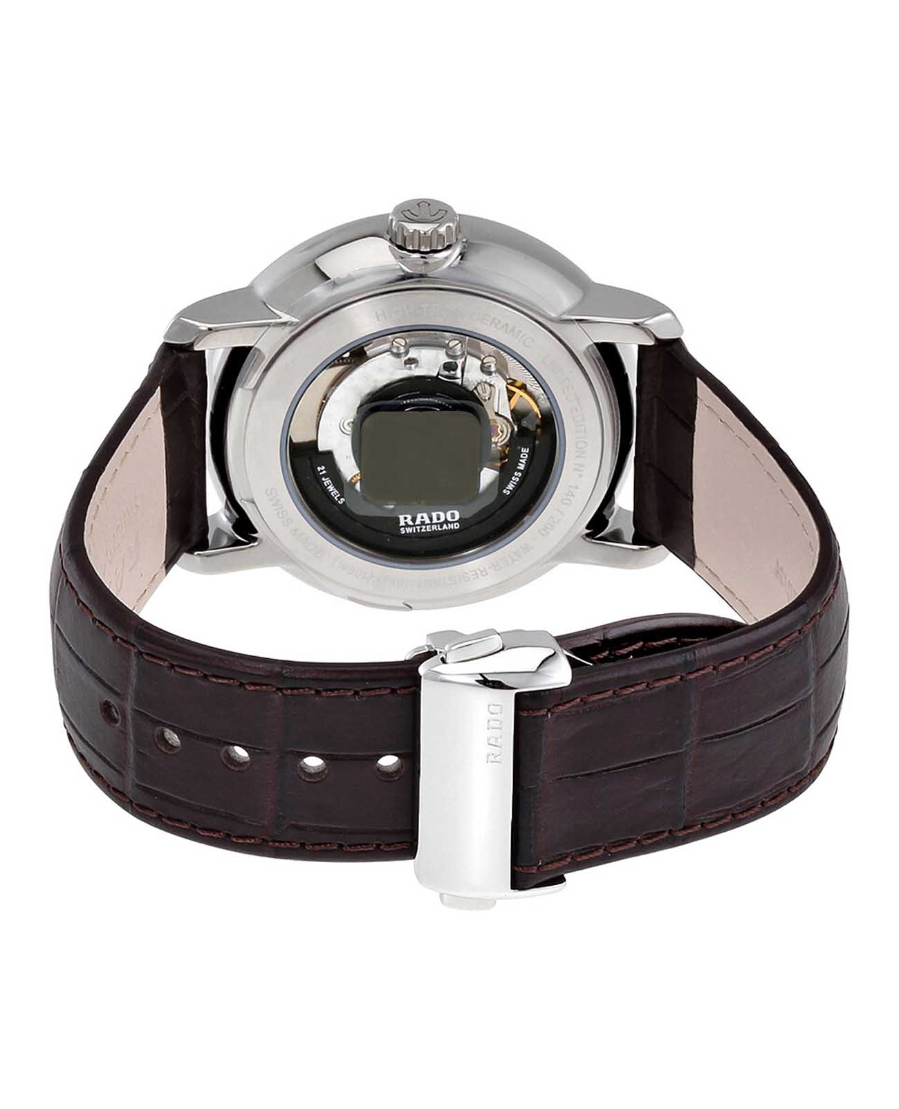 Мужские механические швейцарские часы с автоподзаводом Rado Diamaster R14074146. Сапфировое стеклоСапфировое стеклоПрочный и надёжный материал из кристалла сапфира синтетического происхождения, характеризующийся особой твёрдостью и устойчивостью к царапинам и повреждениям. устойчивое к мелким механическим повреждениям. Корпус часов изготовлен из высокотехнологичной плазменной керамикиВысокотехнологичная плазменная керамикаИнновационный материал, технология запатентована. Выплавление керамики осуществляется в печи при 20 000 °C, белоснежный материал под воздействием ультравысокой температуры приобретает уникальный блеск, присущий металлам.. Окошко даты находится в положении 3 часа. Класс водозащиты: 100 метров, позволит плавать, нырять и заниматься другими водными видами спорта. Кожаный ремешок на раскладной застёжкеРаскладная застёжкаТакой тип застёжки используется только на браслетах из металла. Она никогда не раскрывается полностью, происходит разделение на 2 и более частей. Раскладывающая застёжка снизит вероятность потери часов к минимуму..