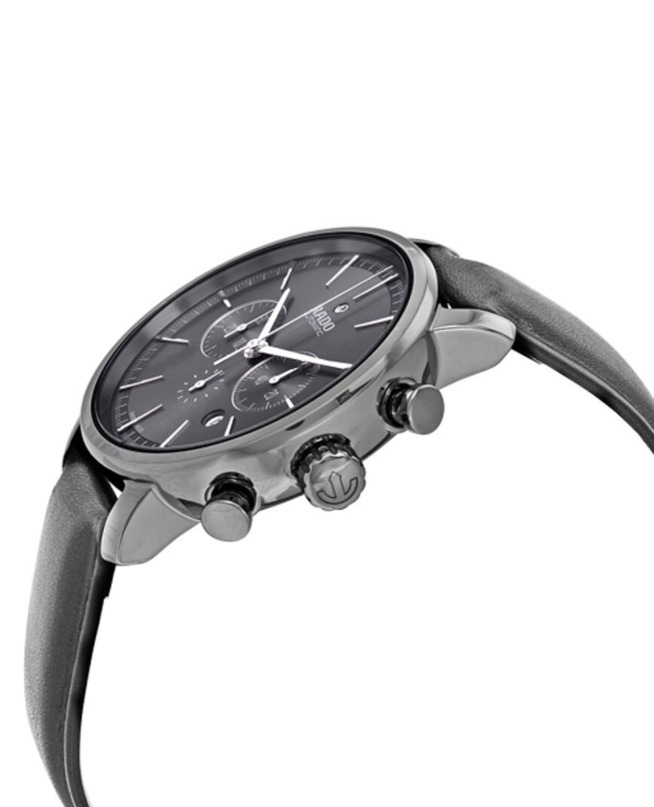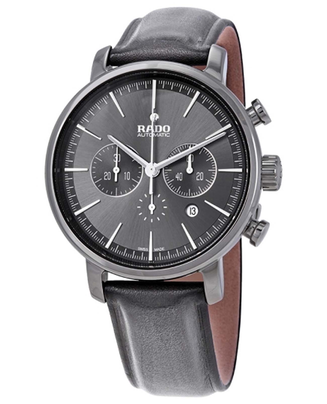 Мужские швейцарские часы-хронографХронографФункция позволяет измерять отрезки времени с особой точностью: часы, минуты, секунды. Верным признаком хронографа является наличие на циферблате 3 дополнительных окошек-счётчиков. Rado HyperChrome Automatic Chronograph R14076115. Корпус часов изготовлен из высокотехнологичной керамикиВысокотехнологичная керамикаИнновационный запатентованный Rado материал с гладкой или матовой поверхностью. Керамика за счёт кристаллической структуры обладает повышенной устойчивостью от возникновения царапин. Материал способен принимать температуру тела человека, обеспечивая невероятный комфорт при ношении.. Сапфировое стеклоСапфировое стеклоПрочный и надёжный материал из кристалла сапфира синтетического происхождения, характеризующийся особой твёрдостью и устойчивостью к царапинам и повреждениям. устойчивое к мелким механическим повреждениям. Окошко даты находится в положении между 4 и 5 часов. Класс водозащиты: 100 метров, позволит плавать, нырять и заниматься другими водными видами спорта. Кожаный ремешок на раскладной застёжкеРаскладная застёжкаТакой тип застёжки используется только на браслетах из металла. Она никогда не раскрывается полностью, происходит разделение на 2 и более частей. Раскладывающая застёжка снизит вероятность потери часов к минимуму..