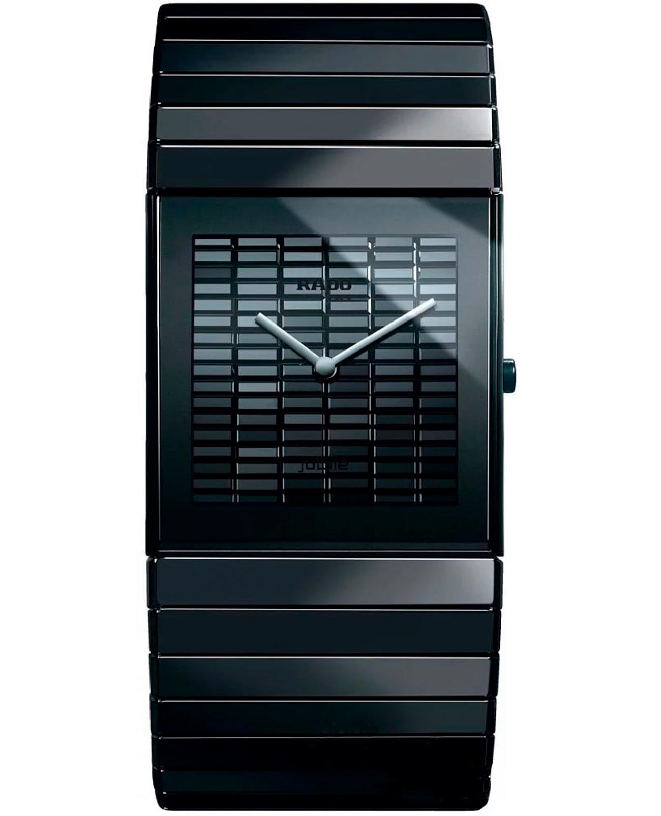 Мужские швейцарские часы Rado Ceramica R21718702, кварцевый механизм с высокой точностью. Сапфировое стеклоСапфировое стеклоПрочный и надёжный материал из кристалла сапфира синтетического происхождения, характеризующийся особой твёрдостью и устойчивостью к царапинам и повреждениям. устойчивое к появлению царапин, обладающее высокой прозрачностью. Корпус часов изготовлен из керамики. Класс водозащиты: 30 метров, позволит защитить корпус от случайных брызг или капель дождя. Керамический браслет на раскладной застёжкеРаскладная застёжкаТакой тип застёжки используется только на браслетах из металла. Она никогда не раскрывается полностью, происходит разделение на 2 и более частей. Раскладывающая застёжка снизит вероятность потери часов к минимуму.. На циферблате 102 прямоугольных бриллианта общим весом 7,49 карата.