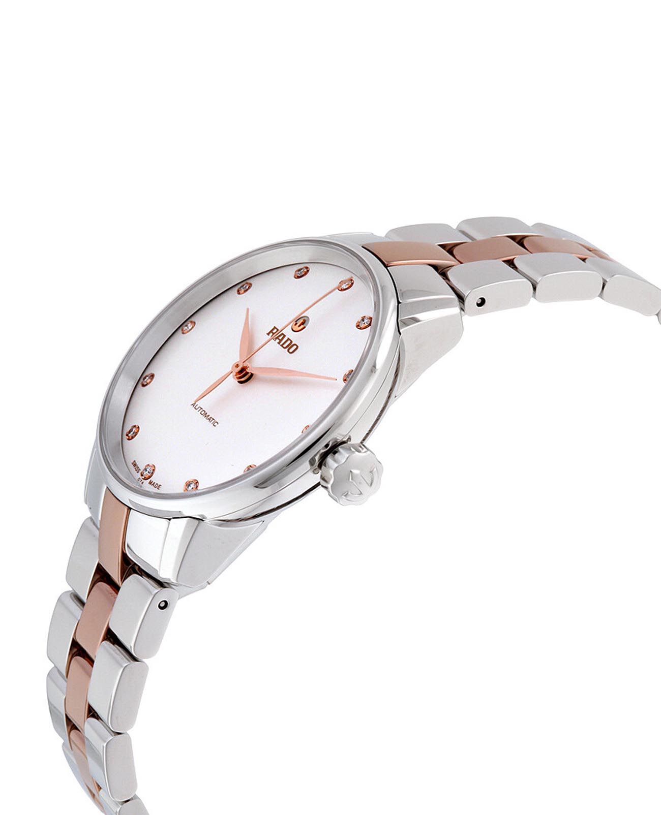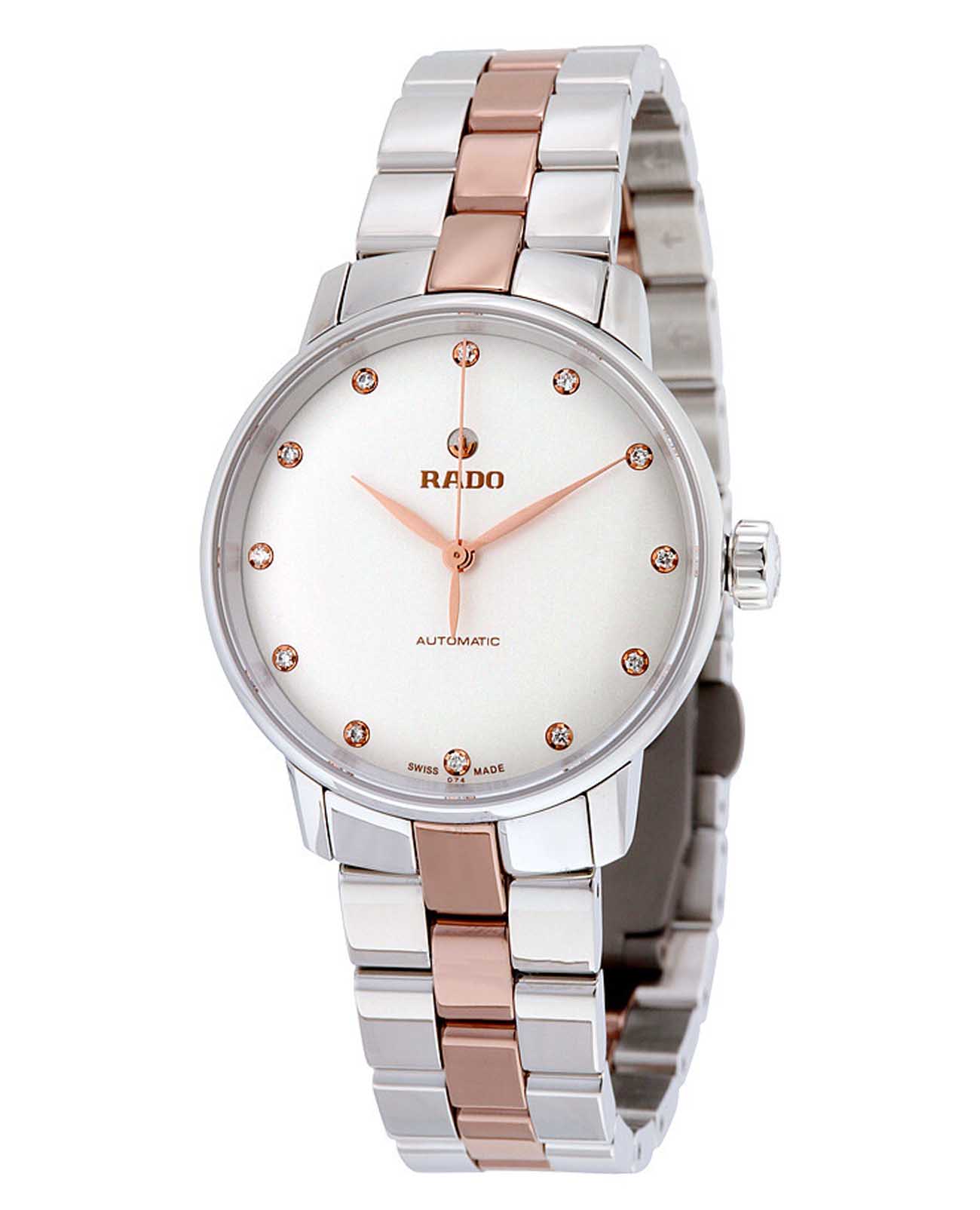 Женские механические швейцарские часы с автоподзаводом Rado Coupole Classic Automatic Diamonds R22862742. Сапфировое стеклоСапфировое стеклоПрочный и надёжный материал из кристалла сапфира синтетического происхождения, характеризующийся особой твёрдостью и устойчивостью к царапинам и повреждениям. устойчивое к мелким механическим повреждениям. Корпус часов изготовлен из нержавеющей стали. Циферблат украшен бриллиантами. Класс водозащиты: 50 метров, позволит защитить корпус от случайных брызг или капель дождя. Стальной браслет с CeramosCeramosМатериал являет собой инновационное сочетание высокотехнологичной керамики и сплава металла. Он объединяет керамическую устойчивость к царапинам и металлический роскошный блеск. на раскладной застёжкеРаскладная застёжкаТакой тип застёжки используется только на браслетах из металла. Она никогда не раскрывается полностью, происходит разделение на 2 и более частей. Раскладывающая застёжка снизит вероятность потери часов к минимуму..