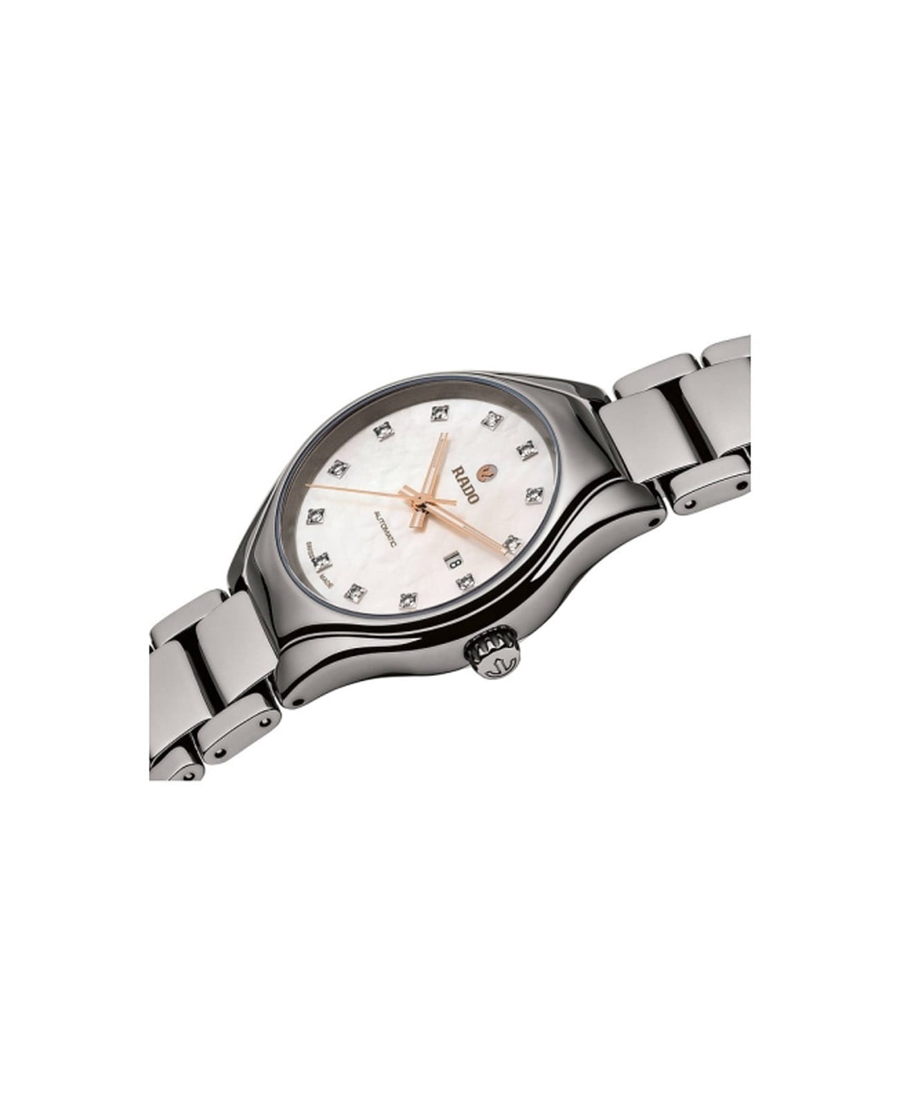 Швейцарские женские механические часы с автоподзаводом Rado True Automatic Diamonds R27243902. Сапфировое стеклоСапфировое стеклоПрочный и надёжный материал из кристалла сапфира синтетического происхождения, характеризующийся особой твёрдостью и устойчивостью к царапинам и повреждениям. устойчивое к появлению царапин, обладающее высокой прозрачностью. Корпус часов изготовлен из высокотехнологичной плазменной керамикиВысокотехнологичная плазменная керамикаИнновационный материал, технология запатентована. Выплавление керамики осуществляется в печи при 20 000 °C, белоснежный материал под воздействием ультравысокой температуры приобретает уникальный блеск, присущий металлам.. Циферблат украшен бриллиантами. Окошко даты находится в положении 3 часа. Стрелки с люминесцентным покрытиемЛюминесцентное покрытиеПозволяет считывать показания времени в темноте. Производители наносят на стрелки, часовые индексы, безель или поверхность циферблата светонакопительный состав, дающий холодное свечение.. Класс водозащиты: 50 метров, позволит защитить корпус от случайных брызг или капель дождя. Браслет из высокотехнологичной плазменной керамикиВысокотехнологичная плазменная керамикаИнновационный материал, технология запатентована. Выплавление керамики осуществляется в печи при 20 000 °C, белоснежный материал под воздействием ультравысокой температуры приобретает уникальный блеск, присущий металлам. на застёжке-бабочке с кнопкамиЗастёжка "бабочка"Такой вид застёжки дополняется предохранителями, помогающими избежать случайного раскрытия браслета. Обладают изящным исполнением. .