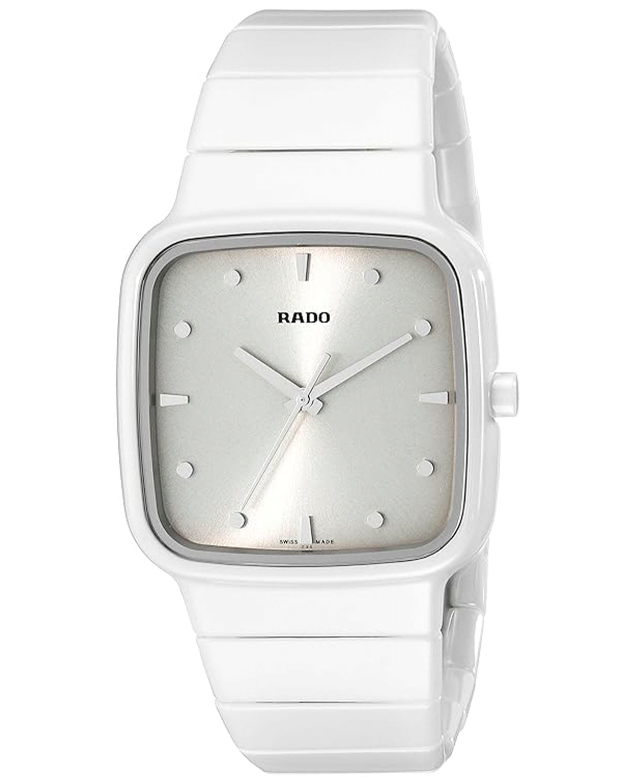 Мужские швейцарские часы Rado R5.5 R28382352. Сапфировое стеклоСапфировое стеклоПрочный и надёжный материал из кристалла сапфира синтетического происхождения, характеризующийся особой твёрдостью и устойчивостью к царапинам и повреждениям. устойчивое к мелким механическим повреждениям. Корпус часов изготовлен из высокотехнологичной плазменной керамикиВысокотехнологичная плазменная керамикаИнновационный материал, технология запатентована. Выплавление керамики осуществляется в печи при 20 000 °C, белоснежный материал под воздействием ультравысокой температуры приобретает уникальный блеск, присущий металлам.. Стрелки и метки с люминесцентным покрытиемЛюминесцентное покрытиеПозволяет считывать показания времени в темноте. Производители наносят на стрелки, часовые индексы, безель или поверхность циферблата светонакопительный состав, дающий холодное свечение.. Класс водозащиты: 30 метров, позволит защитить корпус от случайных брызг или капель дождя. Браслет из высокотехнологичной плазменной керамикиВысокотехнологичная плазменная керамикаИнновационный материал, технология запатентована. Выплавление керамики осуществляется в печи при 20 000 °C, белоснежный материал под воздействием ультравысокой температуры приобретает уникальный блеск, присущий металлам. на раскладной застёжкеРаскладная застёжкаТакой тип застёжки используется только на браслетах из металла. Она никогда не раскрывается полностью, происходит разделение на 2 и более частей. Раскладывающая застёжка снизит вероятность потери часов к минимуму..