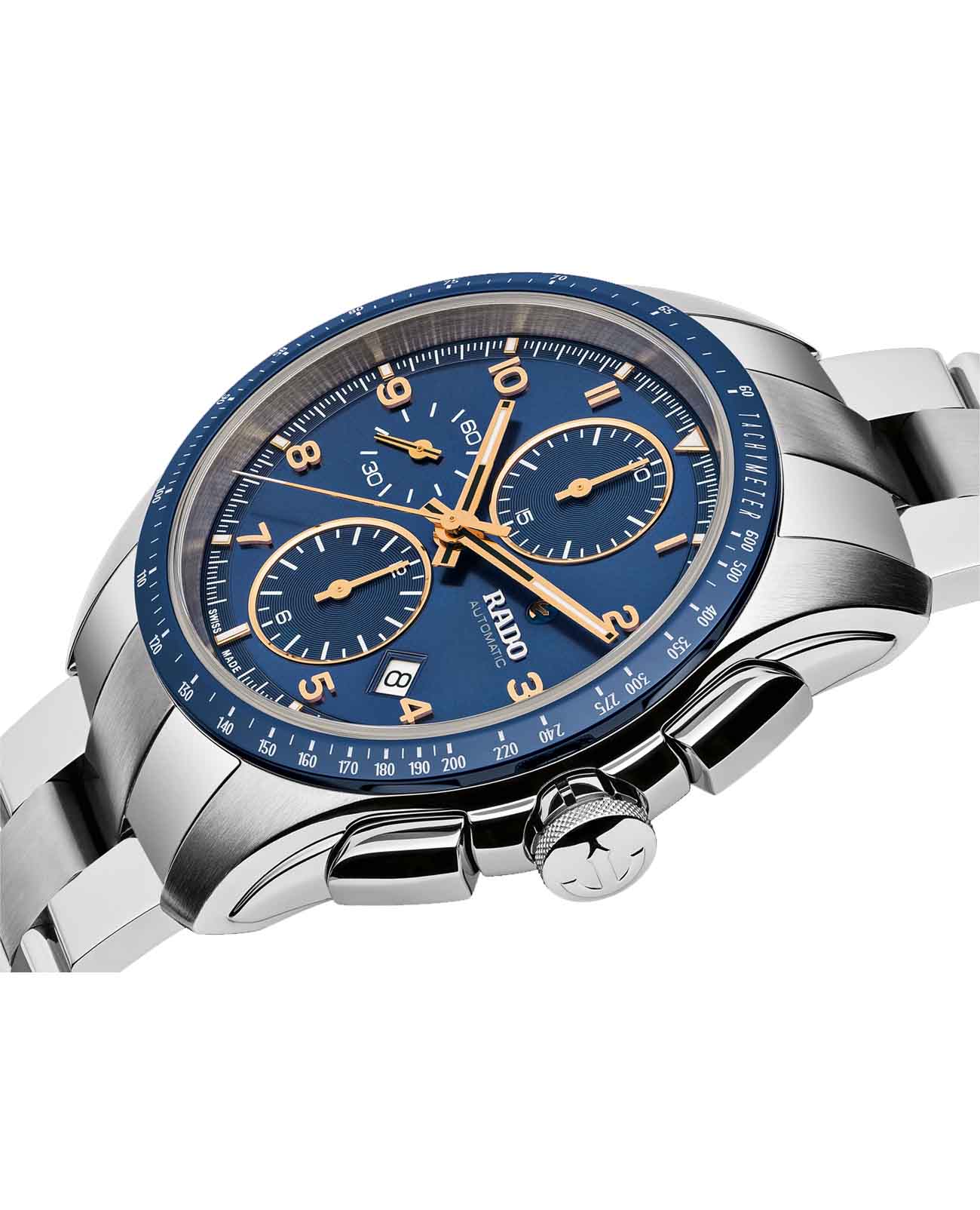 Мужские механические швейцарские часы-хронографХронографФункция позволяет измерять отрезки времени с особой точностью: часы, минуты, секунды. Верным признаком хронографа является наличие на циферблате 3 дополнительных окошек-счётчиков. с автоподзаводом Rado Hyperchrome Automatic Chronograph R32042303. Сапфировое стеклоСапфировое стеклоПрочный и надёжный материал из кристалла сапфира синтетического происхождения, характеризующийся особой твёрдостью и устойчивостью к царапинам и повреждениям. устойчивое к мелким механическим повреждениям. Корпус часов изготовлен из нержавеющей стали и титана. БезельБезельВнешний ободок, закрепляющий стекло. В спортивных часах так называется поворотное кольцо с делениями на циферблате, выполняет роль таймера – замеряет отрезки времени на шкале. Неподвижный безель – элемент декора. Однонаправленно вращающийся безель на дайверских часах позволяет фиксировать моменты погружения и выныривания на поверхность. со шкалой тахиметраТахиметрРазмеченная шкала, располагается на ободке или безеле часов. Тахиметр позволяет рассчитать скорость на определённом участке пути, расстояние измеряется в километрах или милях. из высокотехнологичной керамикиВысокотехнологичная керамикаИнновационный запатентованный Rado материал с гладкой или матовой поверхностью. Керамика за счёт кристаллической структуры обладает повышенной устойчивостью от возникновения царапин. Материал способен принимать температуру тела человека, обеспечивая невероятный комфорт при ношении.. Окошко даты находится в положении между 4 и 5 часами. Стрелки с люминесцентным покрытиемЛюминесцентное покрытиеПозволяет считывать показания времени в темноте. Производители наносят на стрелки, часовые индексы, безель или поверхность циферблата светонакопительный состав, дающий холодное свечение.. Класс водозащиты: 100 метров, позволит плавать, нырять и заниматься другими водными видами спорта. Браслет из нержавеющей стали и титана на раскладной застёжкеРаскладная застёжкаТакой тип застёжки используется только на браслетах из металла. Она никогда не раскрывается полностью, происходит разделение на 2 и более частей. Раскладывающая застёжка снизит вероятность потери часов к минимуму..