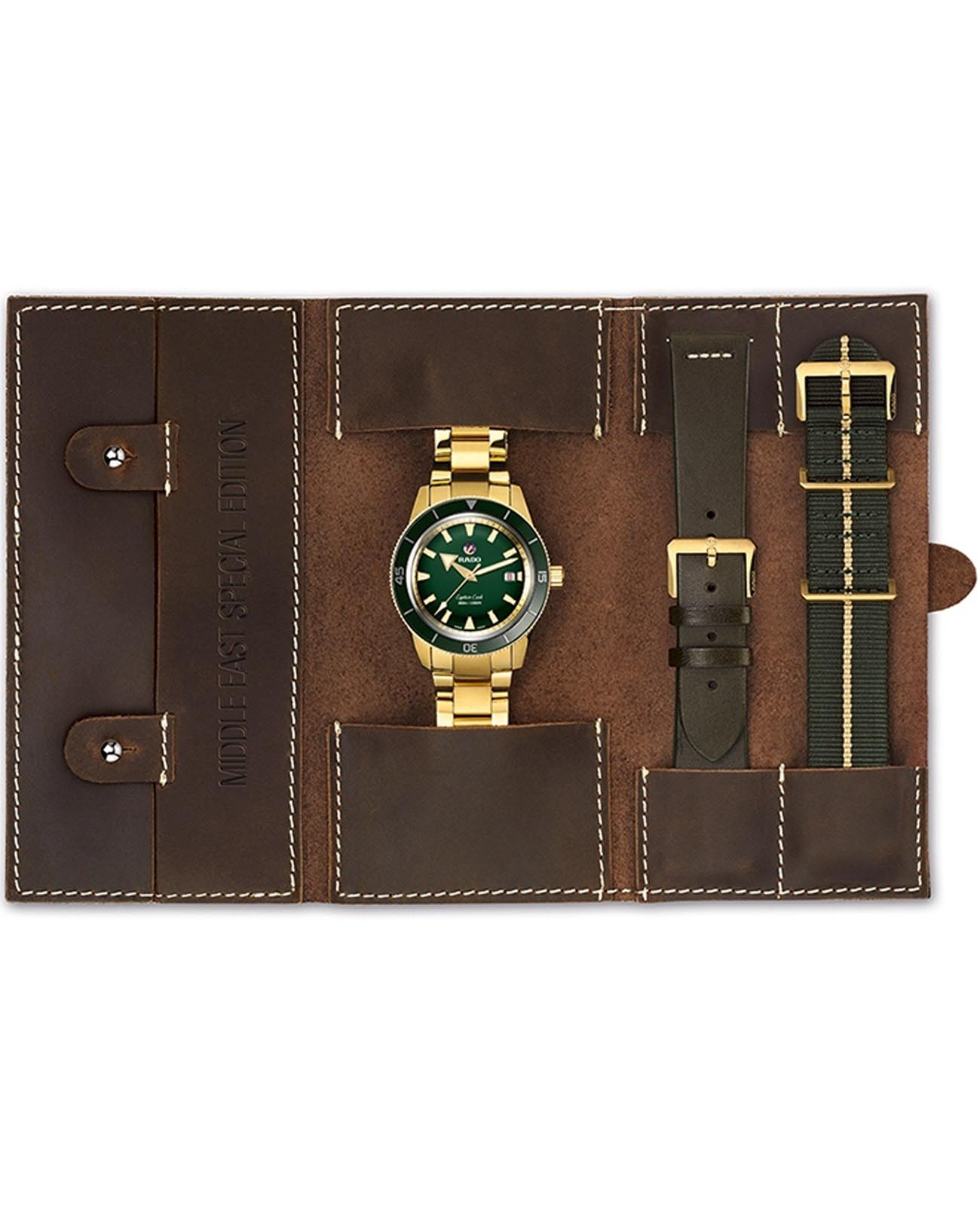 Мужские механические часы с автоматическим механизмом Rado Captain Cook Automatic R32136318. В комплект входит два дополнительных ремешка. Корпус и браслет часов изготовлены из нержавеющей стали с PVD-покрытиемPVDУльтратонкое покрытие наносится в технике вакуумного напыления, сочетает в себе нитрид титана особой прочности со слоем золота или оксида хрома. Несёт в себе декоративную или защитную функцию.. Сапфировое стеклоСапфировое стеклоПрочный и надёжный материал из кристалла сапфира синтетического происхождения, характеризующийся особой твёрдостью и устойчивостью к царапинам и повреждениям. с антибликовым покрытиемАнтибликовое покрытиеСлой оксида металла в 0,13-0,3 микрон, благодаря которому стекло часов не бликует и не отражает свет. Антибликовое покрытие уменьшает отражение света в 10 раз, обеспечивая отличную читаемость показателей циферблата., устойчивое к мелким механическим повреждениям. Стальной браслет на раскладной застёжкеРаскладная застёжкаТакой тип застёжки используется только на браслетах из металла. Она никогда не раскрывается полностью, происходит разделение на 2 и более частей. Раскладывающая застёжка снизит вероятность потери часов к минимуму.. Класс водозащиты: 300 метров, позволит плавать, нырять и заниматься другими водными видами спорта. Вращающийся безельБезельВнешний ободок, закрепляющий стекло. В спортивных часах так называется поворотное кольцо с делениями на циферблате, выполняет роль таймера – замеряет отрезки времени на шкале. Неподвижный безель – элемент декора. Однонаправленно вращающийся безель на дайверских часах позволяет фиксировать моменты погружения и выныривания на поверхность. с PVD-покрытиемPVDУльтратонкое покрытие наносится в технике вакуумного напыления, сочетает в себе нитрид титана особой прочности со слоем золота или оксида хрома. Несёт в себе декоративную или защитную функцию.. Стрелки и метки с люминесцентным покрытиемЛюминесцентное покрытиеПозволяет считывать показания времени в темноте. Производители наносят на стрелки, часовые индексы, безель или поверхность циферблата светонакопительный состав, дающий холодное свечение.. Окошко даты находится в положении 3 часа.