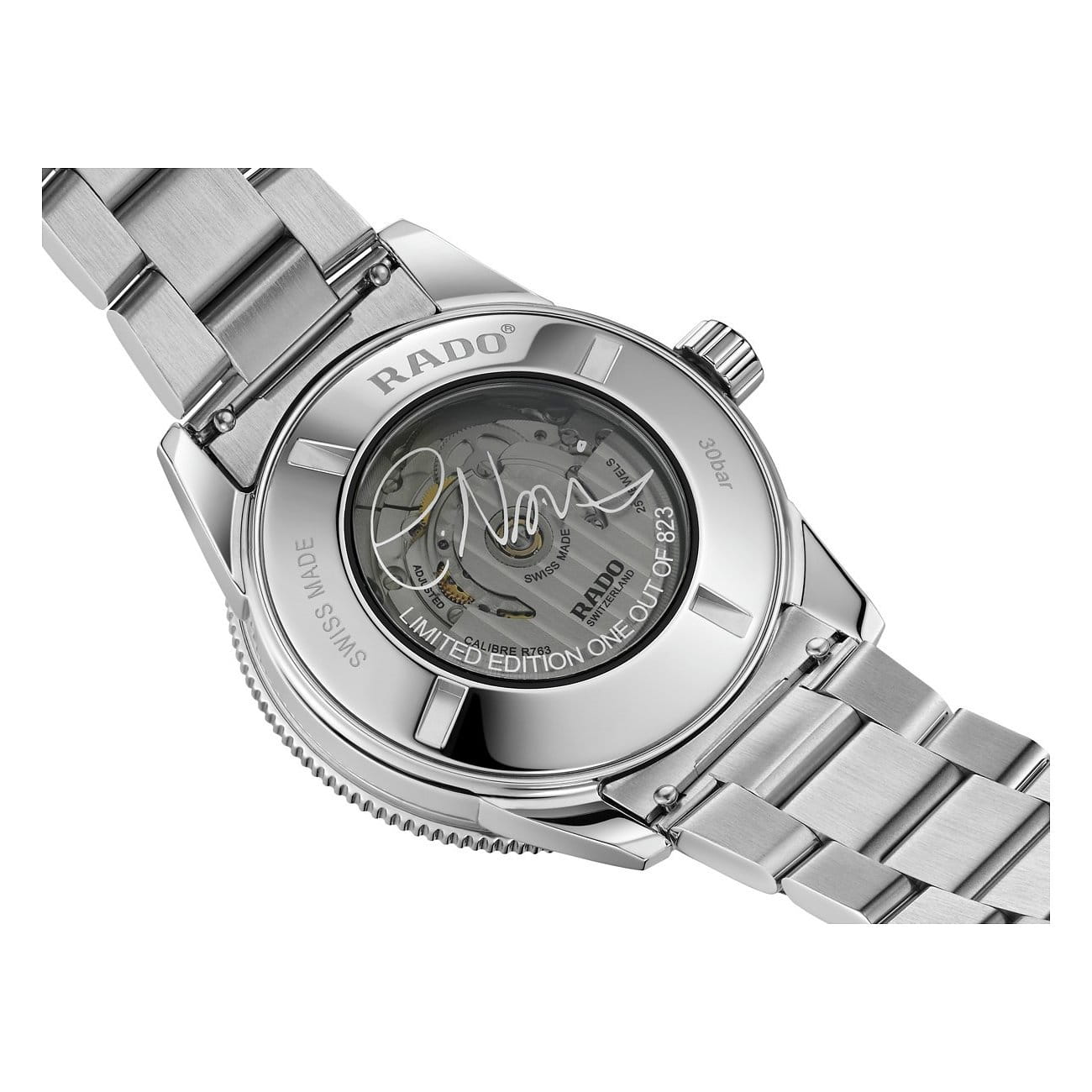 На задней крышке корпуса нанесена металлизированная надпись LIMITED EDITION, ONE OF 823 – ссылка на количество моделей из этого ограниченного выпуска, отсылающая к дню рождения звезды тенниса 23 августа. БезельБезельВнешний ободок, закрепляющий стекло. В спортивных часах так называется поворотное кольцо с делениями на циферблате, выполняет роль таймера – замеряет отрезки времени на шкале. Неподвижный безель – элемент декора. Однонаправленно вращающийся безель на дайверских часах позволяет фиксировать моменты погружения и выныривания на поверхность. изготовлен из высокотехнологичной керамикиВысокотехнологичная керамикаИнновационный запатентованный Rado материал с гладкой или матовой поверхностью. Керамика за счёт кристаллической структуры обладает повышенной устойчивостью от возникновения царапин. Материал способен принимать температуру тела человека, обеспечивая невероятный комфорт при ношении., устойчивой к возникновению царапин. Аксессуар выполнен в спортивном стиле, но сдержанная цветовая гамма и лаконичный облик позволяет ему удачно гармонировать с деловой одеждой. Сапфировое стекло имеет антибликовую обработку. Завинчивающаяся заводная головка и задняя крышка усиливают водостойкость до 300 метров. Для стрелок используется люминесцентное покрытиеЛюминесцентное покрытиеПозволяет считывать показания времени в темноте. Производители наносят на стрелки, часовые индексы, безель или поверхность циферблата светонакопительный состав, дающий холодное свечение.. Отображение числа на метке 3 часов. Диаметр корпуса: 42 мм. Браслет из нержавеющей стали с раскладывающейся застежкой сводит к минимуму вероятность потери модели. В комплекте идут 2 дополнительных ремешка: из натуральной кожи и текстильный ремешок НАТО.