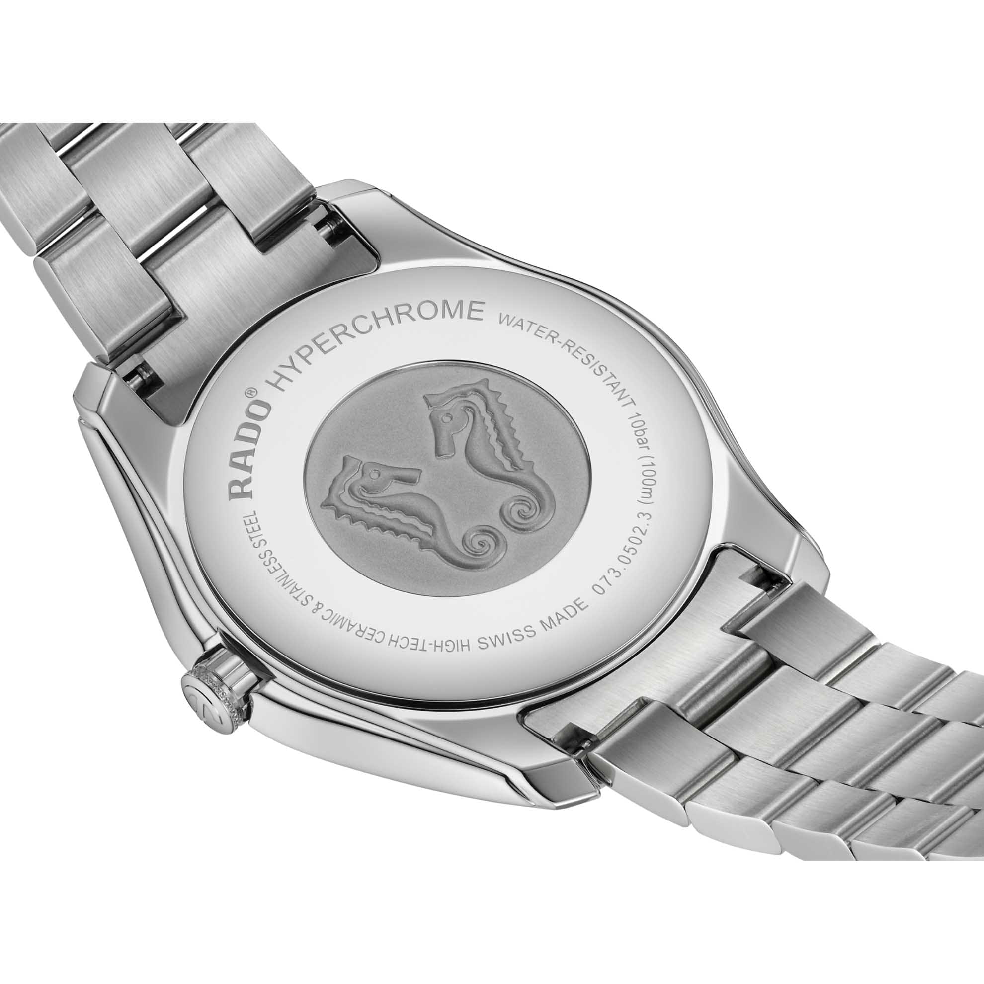 Мужские кварцевые часы Rado HyperChrome — это стильный и современный аксессуар с динамичным дизайном. Корпус диаметром 44 мм и толщиной 11,7 мм выполнен из нержавеющей стали. БезельБезельВнешний ободок, закрепляющий стекло. В спортивных часах так называется поворотное кольцо с делениями на циферблате, выполняет роль таймера – замеряет отрезки времени на шкале. Неподвижный безель – элемент декора. Однонаправленно вращающийся безель на дайверских часах позволяет фиксировать моменты погружения и выныривания на поверхность. — комбинированный, из нержавеющей стали с PVD-покрытиемPVDУльтратонкое покрытие наносится в технике вакуумного напыления, сочетает в себе нитрид титана особой прочности со слоем золота или оксида хрома. Несёт в себе декоративную или защитную функцию., с метками из Super-Luminova®. Циферблат зелёного цвета оформлен индексами и стрелками с люминесцентным покрытиемЛюминесцентное покрытиеПозволяет считывать показания времени в темноте. Производители наносят на стрелки, часовые индексы, безель или поверхность циферблата светонакопительный состав, дающий холодное свечение. Super-Luminova®, обеспечивающим хорошую читаемость в темноте. Циферблат защищён сапфировым стекломСапфировое стеклоПрочный и надёжный материал из кристалла сапфира синтетического происхождения, характеризующийся особой твёрдостью и устойчивостью к царапинам и повреждениям. с антибликовым покрытиемАнтибликовое покрытиеСлой оксида металла в 0,13-0,3 микрон, благодаря которому стекло часов не бликует и не отражает свет. Антибликовое покрытие уменьшает отражение света в 10 раз, обеспечивая отличную читаемость показателей циферблата.. Механизм — кварцевый калибр R073. Водонепроницаемость 200 wr, что позволяет плавать и нырять. Часы оснащены браслетом из нержавеющей стали и застёжкой «бабочка» с кнопкамиЗастёжка "бабочка"Такой вид застёжки дополняется предохранителями, помогающими избежать случайного раскрытия браслета. Обладают изящным исполнением. из титана и нержавеющей стали. Окошко даты расположено в положении 3 часов. Универсальный выбор для тех, кто ценит элегантность, надёжность и современный стиль.