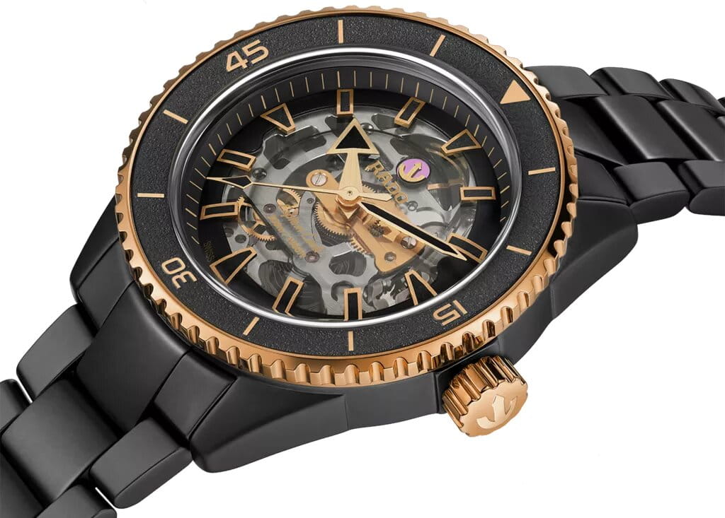Мужские швейцарские механические часы Rado Captain Cook High-Tech Ceramic R32192152. Сапфировое стеклоСапфировое стеклоПрочный и надёжный материал из кристалла сапфира синтетического происхождения, характеризующийся особой твёрдостью и устойчивостью к царапинам и повреждениям. устойчивое к мелким механическим повреждениям. Корпус часов изготовлены из Высокотехнологичной керамикиВысокотехнологичная керамикаИнновационный запатентованный Rado материал с гладкой или матовой поверхностью. Керамика за счёт кристаллической структуры обладает повышенной устойчивостью от возникновения царапин. Материал способен принимать температуру тела человека, обеспечивая невероятный комфорт при ношении.. Керамический безельБезельВнешний ободок, закрепляющий стекло. В спортивных часах так называется поворотное кольцо с делениями на циферблате, выполняет роль таймера – замеряет отрезки времени на шкале. Неподвижный безель – элемент декора. Однонаправленно вращающийся безель на дайверских часах позволяет фиксировать моменты погружения и выныривания на поверхность.. Стрелки и метки с люминесцентным покрытиемЛюминесцентное покрытиеПозволяет считывать показания времени в темноте. Производители наносят на стрелки, часовые индексы, безель или поверхность циферблата светонакопительный состав, дающий холодное свечение.. Скелетонизированный циферблат. Класс водозащиты: 300 метров, позволит плавать, нырять и заниматься другими водными видами спорта. Керамический браслет на раскладной застёжкеРаскладная застёжкаТакой тип застёжки используется только на браслетах из металла. Она никогда не раскрывается полностью, происходит разделение на 2 и более частей. Раскладывающая застёжка снизит вероятность потери часов к минимуму..