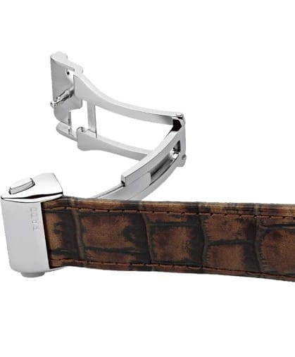 Стильная и лаконичная модель относится к премиальному сегменту. Дизайн отличается классическим обликом и истинной элегантностью, циферблат имеет узор «солнечные лучи». Кожаный ремешок с раскладной застёжкойРаскладная застёжкаТакой тип застёжки используется только на браслетах из металла. Она никогда не раскрывается полностью, происходит разделение на 2 и более частей. Раскладывающая застёжка снизит вероятность потери часов к минимуму.. Автоподзавод. Швейцарский автоматический механизм ETA C07.611 с увеличенным запасом хода до 80 часов. Выпуклое стекло из сапфира Сапфировое стеклоПрочный и надёжный материал из кристалла сапфира синтетического происхождения, характеризующийся особой твёрдостью и устойчивостью к царапинам и повреждениям. с антибликовой поверхностью. Прозрачная задняя крышка. Окошко даты в положении 3 часа. Диаметр корпуса: 42 мм.