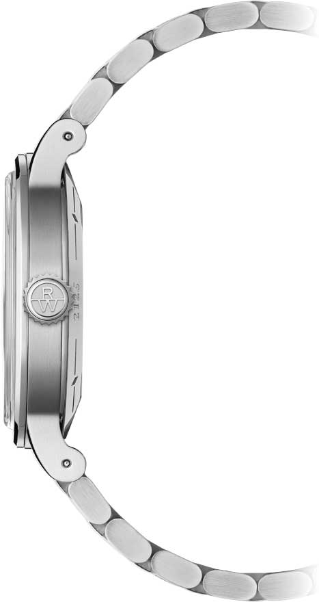 Прозрачная задняя крышка с сапфировым стекломСапфировое стеклоПрочный и надёжный материал из кристалла сапфира синтетического происхождения, характеризующийся особой твёрдостью и устойчивостью к царапинам и повреждениям.. Рифленая заводная головка с логотипом RW.