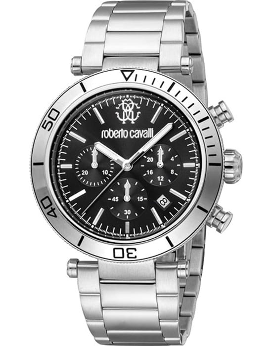 Roberto Cavalli Ritmo RC5G128M0055 — мужская кварцевая модель с ярко выраженным спортивным стилем и практичным функционалом, сочетающая строгий дизайн и надёжность. Корпус диаметром 43 мм и толщиной 12 мм выполнен из нержавеющей стали, защищён прочным минеральным стекломМинеральное стеклоМинеральное стекло представляет собой искусственно выращенный минерал кварца. Такое стекло отличается особой устойчивостью к повреждениям и царапинам. Уступает по некоторым качествам сапфировому стеклу., устойчивым к повседневным повреждениям и сохраняющим хорошую читаемость циферблата. БезельБезельВнешний ободок, закрепляющий стекло. В спортивных часах так называется поворотное кольцо с делениями на циферблате, выполняет роль таймера – замеряет отрезки времени на шкале. Неподвижный безель – элемент декора. Однонаправленно вращающийся безель на дайверских часах позволяет фиксировать моменты погружения и выныривания на поверхность.. Водозащита 100 м делает часы надёжным спутником во время плавания и активного отдыха. Функциональность поддерживается индикаторами хронографаХронографФункция позволяет измерять отрезки времени с особой точностью: часы, минуты, секунды. Верным признаком хронографа является наличие на циферблате 3 дополнительных окошек-счётчиков. и даты, которые органично вписаны в оформление циферблата. Стальной браслет на застёжке-бабочке с кнопкамиЗастёжка "бабочка"Такой вид застёжки дополняется предохранителями, помогающими избежать случайного раскрытия браслета. Обладают изящным исполнением. обеспечивает комфортную посадку и долговечность, а также гармонично завершает образ модели, которая одинаково хорошо подойдёт как для динамичного повседневного ритма, так и для более строгих ситуаций.