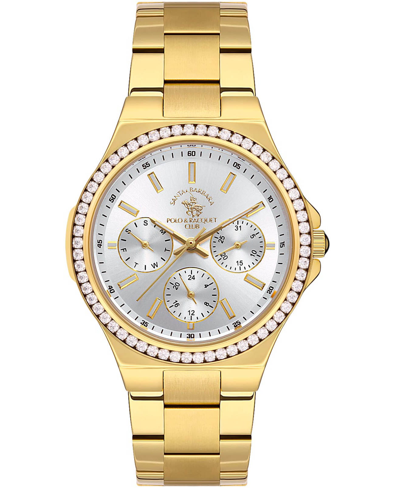 Женские кварцевые часы Santa Barbara Polo & Racquet Club — это функциональный и стильный аксессуар для активной женщины. Корпус диаметром 34 мм и высотой 42 мм выполнен из латуни с IP-покрытиемIP-покрытиеМетод ионного напыления. Демонстрирует повышенную устойчивость к истиранию, окислению и химическим веществам. Под воздействием высокого давления и температуры около 1500°C молекулы металла надёжно соединяются с частицами корпуса часов. и украшен кристаллами. Циферблат серебристого цвета оформлен по технологии Sunray («солнечные лучи»), дополнен накладными метками в виде штрихов и фирменным логотипом. Указатели дня недели и даты вынесены на отдельные субциферблаты, также присутствует индикация 24-часового формата времени. Стрелки и метки с люминесцентным покрытиемЛюминесцентное покрытиеПозволяет считывать показания времени в темноте. Производители наносят на стрелки, часовые индексы, безель или поверхность циферблата светонакопительный состав, дающий холодное свечение., обеспечивающим хорошую читаемость в темноте. Циферблат защищён минеральным стекломМинеральное стеклоМинеральное стекло представляет собой искусственно выращенный минерал кварца. Такое стекло отличается особой устойчивостью к повреждениям и царапинам. Уступает по некоторым качествам сапфировому стеклу.. Механизм — кварцевый калибр VX3JE1. Часы оснащены стальным браслетом с IP-покрытиемIP-покрытиеМетод ионного напыления. Демонстрирует повышенную устойчивость к истиранию, окислению и химическим веществам. Под воздействием высокого давления и температуры около 1500°C молекулы металла надёжно соединяются с частицами корпуса часов. и раскладной застёжкойРаскладная застёжкаТакой тип застёжки используется только на браслетах из металла. Она никогда не раскрывается полностью, происходит разделение на 2 и более частей. Раскладывающая застёжка снизит вероятность потери часов к минимуму.. Водонепроницаемость 50 м позволяет использовать часы в повседневных условиях. Идеальный выбор для тех, кто ценит стиль, функциональность и качество.