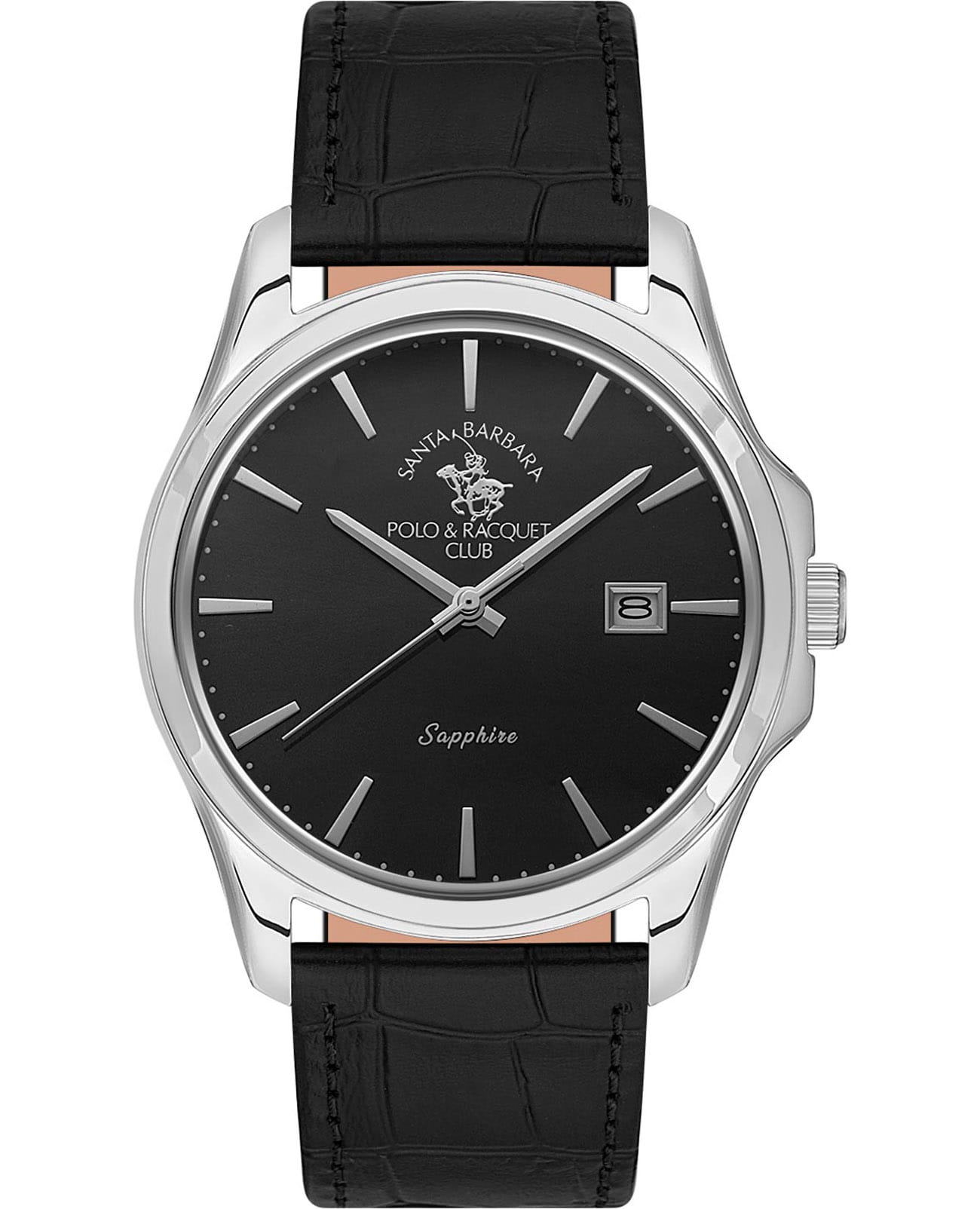 Мужские кварцевые часы Santa Barbara Polo & Racquet Club — это сдержанный и элегантный аксессуар для делового образа. Корпус диаметром 41 мм и высотой 50 мм выполнен из нержавеющей стали 316L. Циферблат чёрного цвета оформлен по технологии Sunray («солнечные лучи»), дополнен накладными метками в виде штрихов и фирменным логотипом. Окошко даты расположено в положении 3 часов. Стрелки мечевидной формы. Циферблат защищён минеральным стеклом. Часы оснащены кожаным ремешком с застёжкой «бабочка» с кнопкамиЗастёжка "бабочка"Такой вид застёжки дополняется предохранителями, помогающими избежать случайного раскрытия браслета. Обладают изящным исполнением. . Водонепроницаемость 50 м позволяет использовать часы в повседневных условиях. Идеальный выбор для тех, кто ценит стиль, надёжность и деловую эстетику.