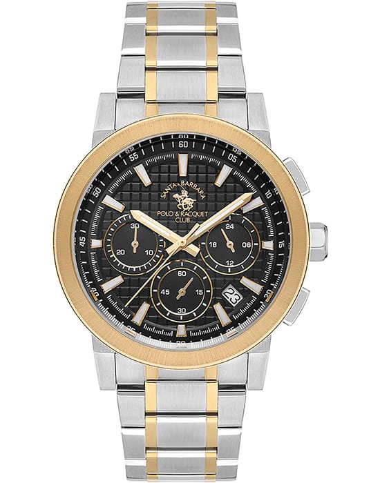 Santa Barbara Polo & Racquet Club — стильный мужской хронограф, сочетающий спортивную динамику и функциональность. Крупный корпус выполнен из нержавеющей стали с PVD-покрытиемPVDУльтратонкое покрытие наносится в технике вакуумного напыления, сочетает в себе нитрид титана особой прочности со слоем золота или оксида хрома. Несёт в себе декоративную или защитную функцию. и гармонично дополнен браслетом с PVD-покрытиемPVDУльтратонкое покрытие наносится в технике вакуумного напыления, сочетает в себе нитрид титана особой прочности со слоем золота или оксида хрома. Несёт в себе декоративную или защитную функцию. на застёжке-бабочке с кнопкамиЗастёжка "бабочка"Такой вид застёжки дополняется предохранителями, помогающими избежать случайного раскрытия браслета. Обладают изящным исполнением. .