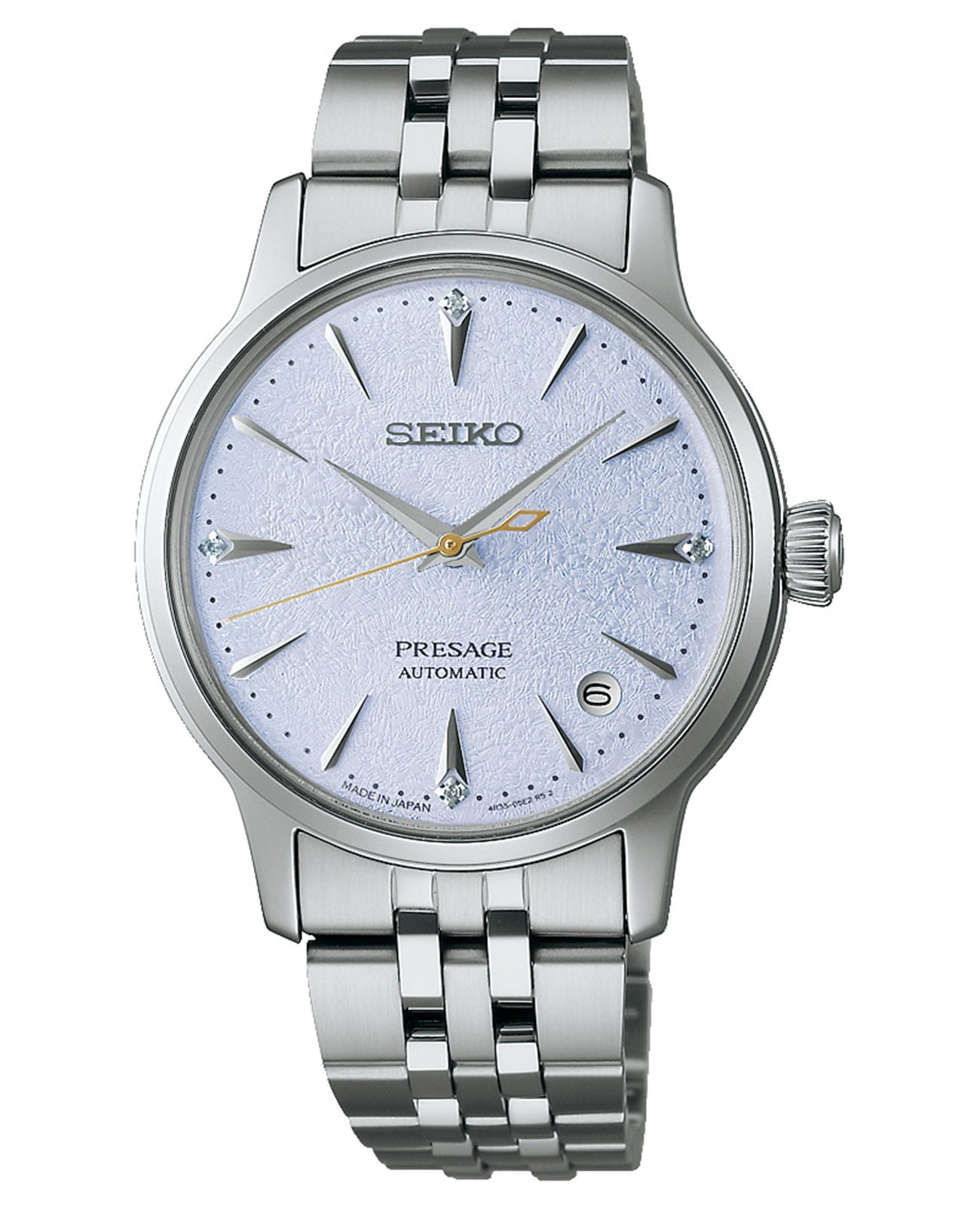 Модель Seiko Presage Cocktail Donna SRPL61 вдохновлена свежестью японского коктейля Frozen Sky Diving. Часы отличаются циферблатом с четырьмя метками из драгоценных камней, что придаёт им особую роскошь и изысканность. Корпус диаметром 34 мм изготовлен из нержавеющей стали, а стекло выполнено по технологии Hardlex — это минеральное стеклоМинеральное стеклоМинеральное стекло представляет собой искусственно выращенный минерал кварца. Такое стекло отличается особой устойчивостью к повреждениям и царапинам. Уступает по некоторым качествам сапфировому стеклу. повышенной прочности, устойчивое к мелким механическим повреждениям. Механизм — автоматический калибр 4R35, обеспечивающий надёжную работу часов и запас хода до 41 часа. Функция отображения даты добавляет модели практичности. Часы водонепроницаемы до 5 атмосфер, что соответствует защите от случайных капель дождя. Браслет и застёжка выполнены из стали, оснащены раскладной застёжкойРаскладная застёжкаТакой тип застёжки используется только на браслетах из металла. Она никогда не раскрывается полностью, происходит разделение на 2 и более частей. Раскладывающая застёжка снизит вероятность потери часов к минимуму., обеспечивающей удобство ношения. Дизайн часов дополнен классическим сочетанием материалов и цветов, что делает их универсальным аксессуаром для повседневного и торжественного образа. Модель 2025 года имеет современный, лаконичный внешний вид, сохраняя при этом традиционные элементы часового мастерства Seiko.
