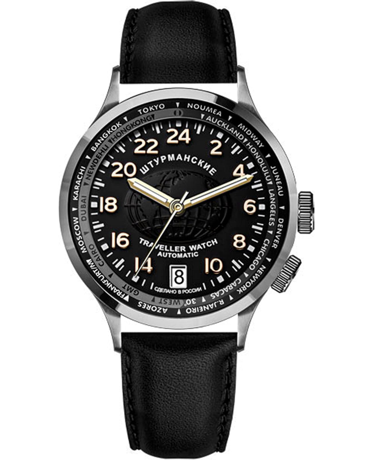 Мужские механические часы с автоподзаводом — это надёжный спутник в любых путешествиях. Корпус диаметром 42 мм выполнен из стали. Циферблат чёрного цвета оформлен индексами и стрелками. Присутствуют функции мирового времени (UTCМировое время Полезное часовое усложнение, отображающее время в основных городах и известных областях по всему миру, оно связано с часовыми поясами, удобно для путешественников и бизнесменов. ), 24-часового формата отображения времени и вращающийся внутренний безельБезельВнешний ободок, закрепляющий стекло. В спортивных часах так называется поворотное кольцо с делениями на циферблате, выполняет роль таймера – замеряет отрезки времени на шкале. Неподвижный безель – элемент декора. Однонаправленно вращающийся безель на дайверских часах позволяет фиксировать моменты погружения и выныривания на поверхность. для удобного определения часовых поясов. Окошко даты расположено в положении 6 часов. Циферблат защищён минеральным стекломМинеральное стеклоМинеральное стекло представляет собой искусственно выращенный минерал кварца. Такое стекло отличается особой устойчивостью к повреждениям и царапинам. Уступает по некоторым качествам сапфировому стеклу.. Часы оснащены кожаным ремешком на классической пряжке. Водонепроницаемость 100 м позволяет использовать часы для плавания и повседневного ношения. Идеальный выбор для тех, кто ценит отечественное качество и универсальный дизайн.