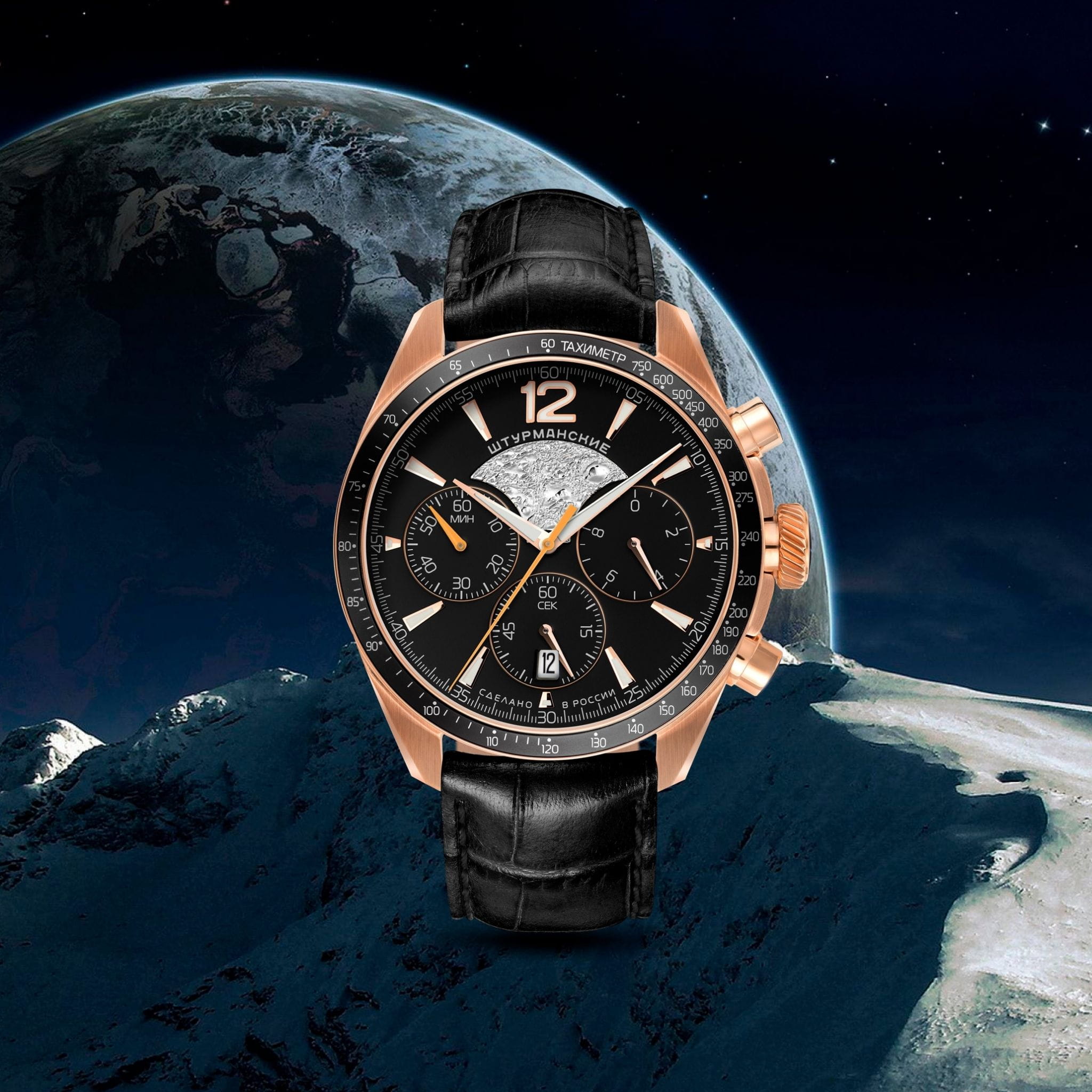 Мужские российские кварцевые часы Штурманские 6S20/4789409, Часы Штурманские из коллекции Луна 25 – это уникальный аксессуар, созданный для настоящих ценителей качественных и стильных часов. Модель воплощает в себе сочетание элегантного дизайна и надежной функциональности. Корпус часов изготовлен из нержавеющей стали PVD-покрытиемPVDУльтратонкое покрытие наносится в технике вакуумного напыления, сочетает в себе нитрид титана особой прочности со слоем золота или оксида хрома. Несёт в себе декоративную или защитную функцию.. БезельБезельВнешний ободок, закрепляющий стекло. В спортивных часах так называется поворотное кольцо с делениями на циферблате, выполняет роль таймера – замеряет отрезки времени на шкале. Неподвижный безель – элемент декора. Однонаправленно вращающийся безель на дайверских часах позволяет фиксировать моменты погружения и выныривания на поверхность. с PVD-покрытиемPVDУльтратонкое покрытие наносится в технике вакуумного напыления, сочетает в себе нитрид титана особой прочности со слоем золота или оксида хрома. Несёт в себе декоративную или защитную функцию.. Минеральное стеклоМинеральное стеклоМинеральное стекло представляет собой искусственно выращенный минерал кварца. Такое стекло отличается особой устойчивостью к повреждениям и царапинам. Уступает по некоторым качествам сапфировому стеклу. защищает циферблат от царапин и повреждений, сохраняя его безупречный внешний вид на протяжении долгого времени. Стрелки часов, выполненные в классическом стиле, имеют люминесцентное покрытие, что обеспечивает удобное считывание времени в условиях низкой освещенности. Класс водозащиты 50 метров, позволит защитить корпус от случайных брызг или капель дождя. Задняя крышка украшена изображением посадочного аппарата Луна-25 на поверхности Луны и крепится на 4-х винтах. Окошко даты находится в положении 6 часов.