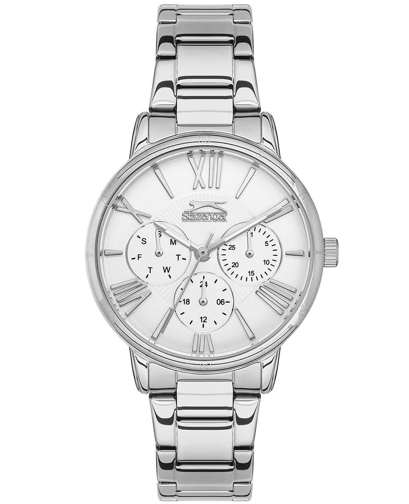 Женские наручные часы Slazenger SL.09.2019.4.01 сочетают в себе элегантный дизайн и практичность современных технологий. Модель обладает круглым корпусом диаметром 36 мм, изготовленным суперметалла, что обеспечивает высокую устойчивость к внешним воздействиям и привлекательный внешний вид. Браслет выполнен из суперметалла и оснащен раскладной застежкойРаскладной замокДанный вариант застежки используется только на часах с металлическим браслетом. Отличительная особенность такого крепления в том, что длина браслета становится универсальной и вы можете самостоятельно отрегулировать нужный вам размер – застежка просто двигается по браслету часов., гарантирующей комфортное ношение и безопасность. Серебристый циферблат украшен малыми циферблатами, которые отображают дату, день недели и текущее время в 24-часовом формате. Для защиты используется минеральное стеклоМинеральное стеклоМинеральное стекло представляет собой искусственно выращенный минерал кварца. Такое стекло отличается особой устойчивостью к повреждениям и царапинам. Уступает по некоторым качествам сапфировому стеклу., обеспечивающее прочную защиту от царапин. Часы работают на кварцевом механизме, что гарантирует точное время без необходимости подзаводки. Водонепроницаемость достигает 30 метров (WR30), что позволяет использовать их при контакте с брызгами воды, однако не рекомендуется для плавания или дайвинга. Вес часов составляет 83 грамма, делая их удобными для повседневного использования.
