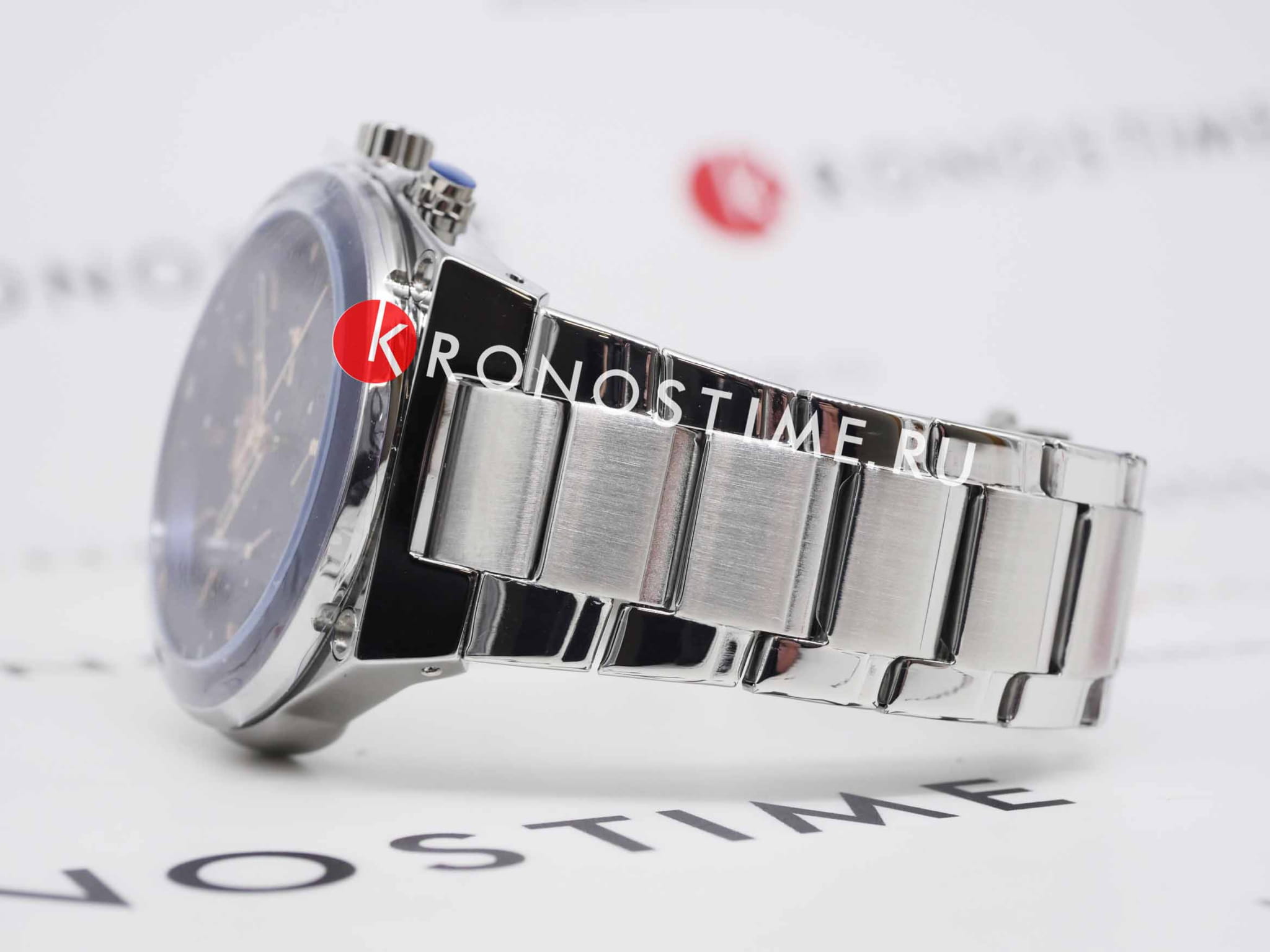Циферблат синего цвета декорирован стрелками с люминесцентным покрытиемЛюминесцентное покрытиеПозволяет считывать показания времени в темноте. Производители наносят на стрелки, часовые индексы, безель или поверхность циферблата светонакопительный состав, дающий холодное свечение., которые обеспечивают читаемость времени даже в условиях недостаточной освещенности. Для защиты используется минеральное стеклоМинеральное стеклоМинеральное стекло представляет собой искусственно выращенный минерал кварца. Такое стекло отличается особой устойчивостью к повреждениям и царапинам. Уступает по некоторым качествам сапфировому стеклу., обеспечивающее прочную защиту от царапин.