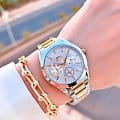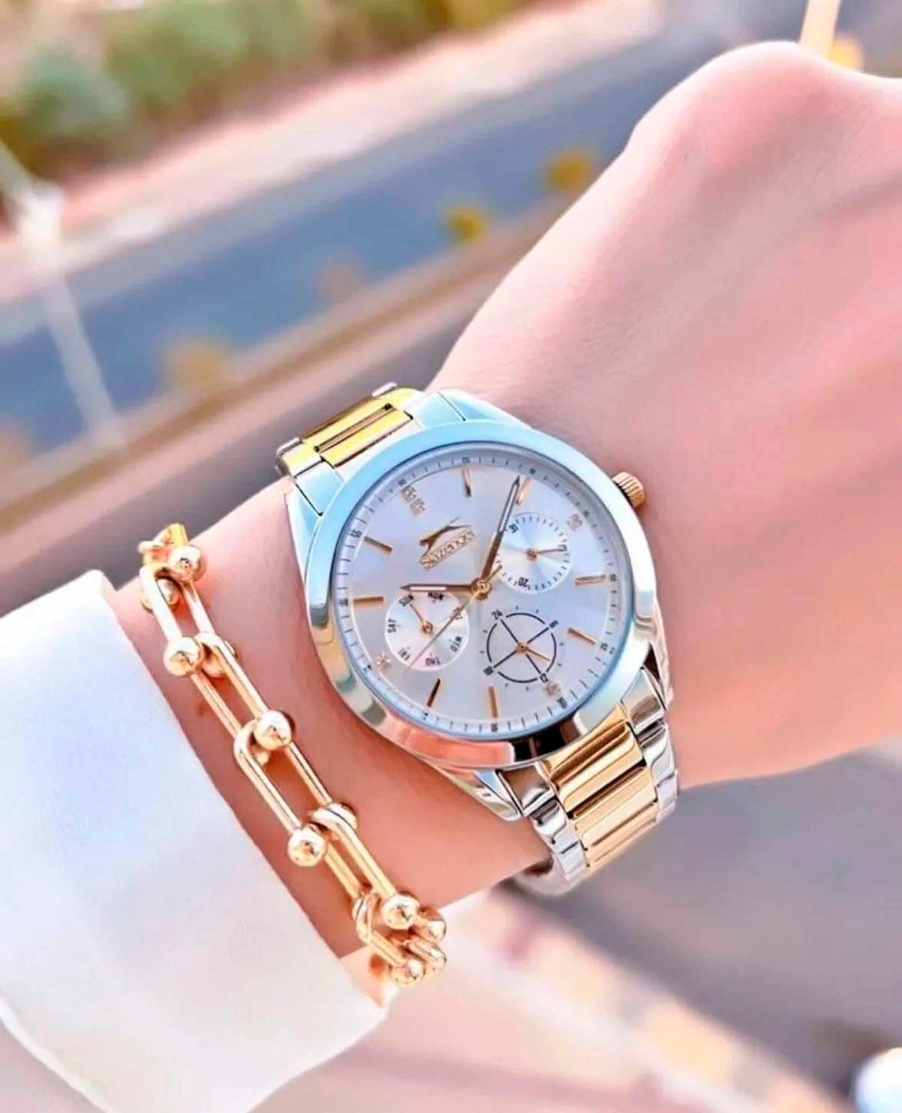 Женские наручные часы Slazenger SL.09.2032.4.04 сочетают в себе элегантный дизайн и надежность современных технологий. Модель обладает круглым корпусом диаметром 35 мм, изготовленным из суперметалла, что обеспечивает высокую устойчивость к внешним воздействиям. Браслет выполнен из того же материала с частичным IP-покрытиемIP-покрытиеМетод ионного напыления. Демонстрирует повышенную устойчивость к истиранию, окислению и химическим веществам. Под воздействием высокого давления и температуры около 1500°C молекулы металла надёжно соединяются с частицами корпуса часов. на раскладной застёжкеРаскладная застёжкаТакой тип застёжки используется только на браслетах из металла. Она никогда не раскрывается полностью, происходит разделение на 2 и более частей. Раскладывающая застёжка снизит вероятность потери часов к минимуму.. Серебристый циферблат оснащен тремя стрелками для показания времени. Для защиты применяется минеральное стеклоМинеральное стеклоМинеральное стекло представляет собой искусственно выращенный минерал кварца. Такое стекло отличается особой устойчивостью к повреждениям и царапинам. Уступает по некоторым качествам сапфировому стеклу., обеспечивающее прочную защиту от царапин. Часы работают на кварцевом механизме, что гарантирует точное время без необходимости подзаводки. Водонепроницаемость часов достигает 3 атмосфер (30 метров), что позволяет использовать их при легком контакте с водой, например, во время мытья рук, но не рекомендуется для плавания.