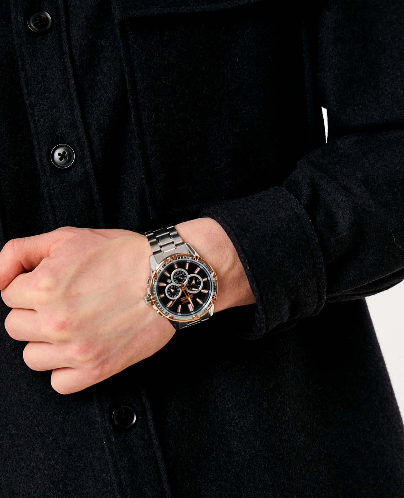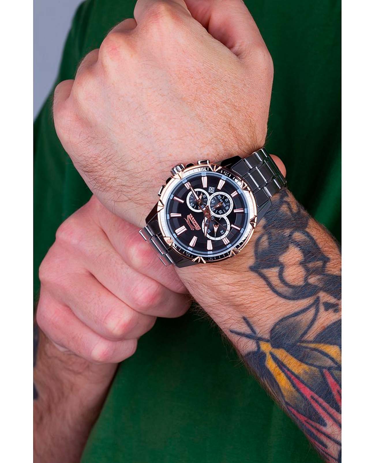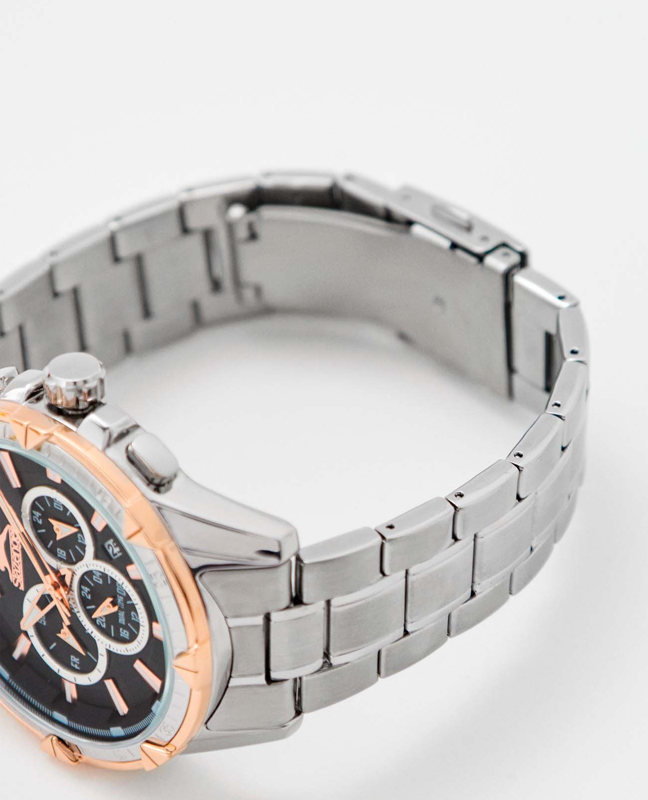 Мужские наручные часы Slazenger SL.09.2035.2.04 сочетают в себе классический дизайн и функциональность для повседневного использования. Модель обладает круглым корпусом диаметром 46 мм, изготовленным из металла, что придает изделию привлекательный внешний вид и обеспечивает устойчивость к царапинам. Браслет выполнен из суперметалла оснащен раскладной застежкойРаскладной замокДанный вариант застежки используется только на часах с металлическим браслетом. Отличительная особенность такого крепления в том, что длина браслета становится универсальной и вы можете самостоятельно отрегулировать нужный вам размер – застежка просто двигается по браслету часов., гарантирующей комфортное ношение и безопасность. БезельБезельВнешний ободок, закрепляющий стекло. В спортивных часах так называется поворотное кольцо с делениями на циферблате, выполняет роль таймера – замеряет отрезки времени на шкале. Неподвижный безель – элемент декора. Однонаправленно вращающийся безель на дайверских часах позволяет фиксировать моменты погружения и выныривания на поверхность. с IP-покрытиемIP-покрытиеМетод ионного напыления. Демонстрирует повышенную устойчивость к истиранию, окислению и химическим веществам. Под воздействием высокого давления и температуры около 1500°C молекулы металла надёжно соединяются с частицами корпуса часов.. Циферблат представлен в черном цвете и дополнен индикаторами даты, дня недели, а также 24-часовым форматом времени, что делает модель практичной для ежедневного использования. Для защиты использовано минеральное стеклоМинеральное стеклоМинеральное стекло представляет собой искусственно выращенный минерал кварца. Такое стекло отличается особой устойчивостью к повреждениям и царапинам. Уступает по некоторым качествам сапфировому стеклу., обеспечивающее надежную защиту от механических повреждений. Часы работают на японском кварцевом механизме, который обеспечивает высокую точность хода без необходимости подзаводки. Функция второго часового поясаВторой часовой поясФункция, позволяющая отображать время двух часовых поясов одновременно. позволяет следить за временем в разных регионах мира, делая модель удобной для путешествий. Водонепроницаемость часов составляет 30 метров (WR30), что позволяет использовать их при легком контакте с водой, например, во время мытья рук или попадания брызг, однако не рекомендуется для плавания или дайвинга.