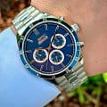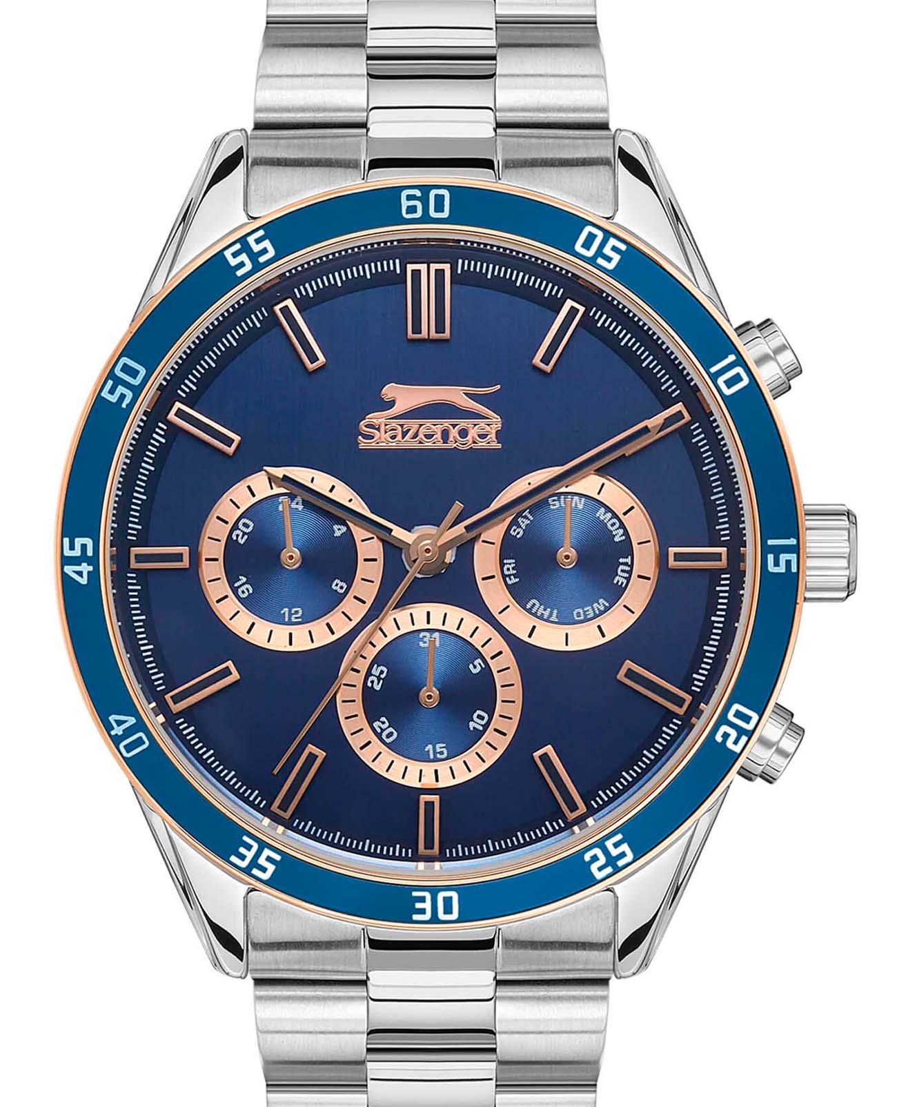 Мужские наручные часы Slazenger SL.09.2109.2.01 сочетают в себе классический дизайн и надежность современных технологий. Модель обладает круглым корпусом диаметром 45 мм, изготовленным из суперметалла, что обеспечивает высокую устойчивость к внешним воздействиям. Браслет выполнен из металла с раскладной застежкойРаскладной замокДанный вариант застежки используется только на часах с металлическим браслетом. Отличительная особенность такого крепления в том, что длина браслета становится универсальной и вы можете самостоятельно отрегулировать нужный вам размер – застежка просто двигается по браслету часов., гарантирующей комфортное ношение и безопасность. Циферблат синего цвета декорирован стрелками с люминесцентным покрытиемЛюминесцентное покрытиеПозволяет считывать показания времени в темноте. Производители наносят на стрелки, часовые индексы, безель или поверхность циферблата светонакопительный состав, дающий холодное свечение., которые обеспечивают читаемость времени даже в условиях недостаточной освещенности. БезельБезельВнешний ободок, закрепляющий стекло. В спортивных часах так называется поворотное кольцо с делениями на циферблате, выполняет роль таймера – замеряет отрезки времени на шкале. Неподвижный безель – элемент декора. Однонаправленно вращающийся безель на дайверских часах позволяет фиксировать моменты погружения и выныривания на поверхность. с IP-покрытиемIP-покрытиеМетод ионного напыления. Демонстрирует повышенную устойчивость к истиранию, окислению и химическим веществам. Под воздействием высокого давления и температуры около 1500°C молекулы металла надёжно соединяются с частицами корпуса часов.. Для защиты используется минеральное стеклоМинеральное стеклоМинеральное стекло представляет собой искусственно выращенный минерал кварца. Такое стекло отличается особой устойчивостью к повреждениям и царапинам. Уступает по некоторым качествам сапфировому стеклу., обеспечивающее прочную защиту от царапин . Часы работают на кварцевом механизме, что гарантирует точное время без необходимости подзаводки. Водонепроницаемость часов достигает 5 атмосфер (WR50), что позволяет использовать их во время плавания, однако они не предназначены для дайвинга или других водных видов спорта. Толщина модели составляет 12 мм.