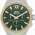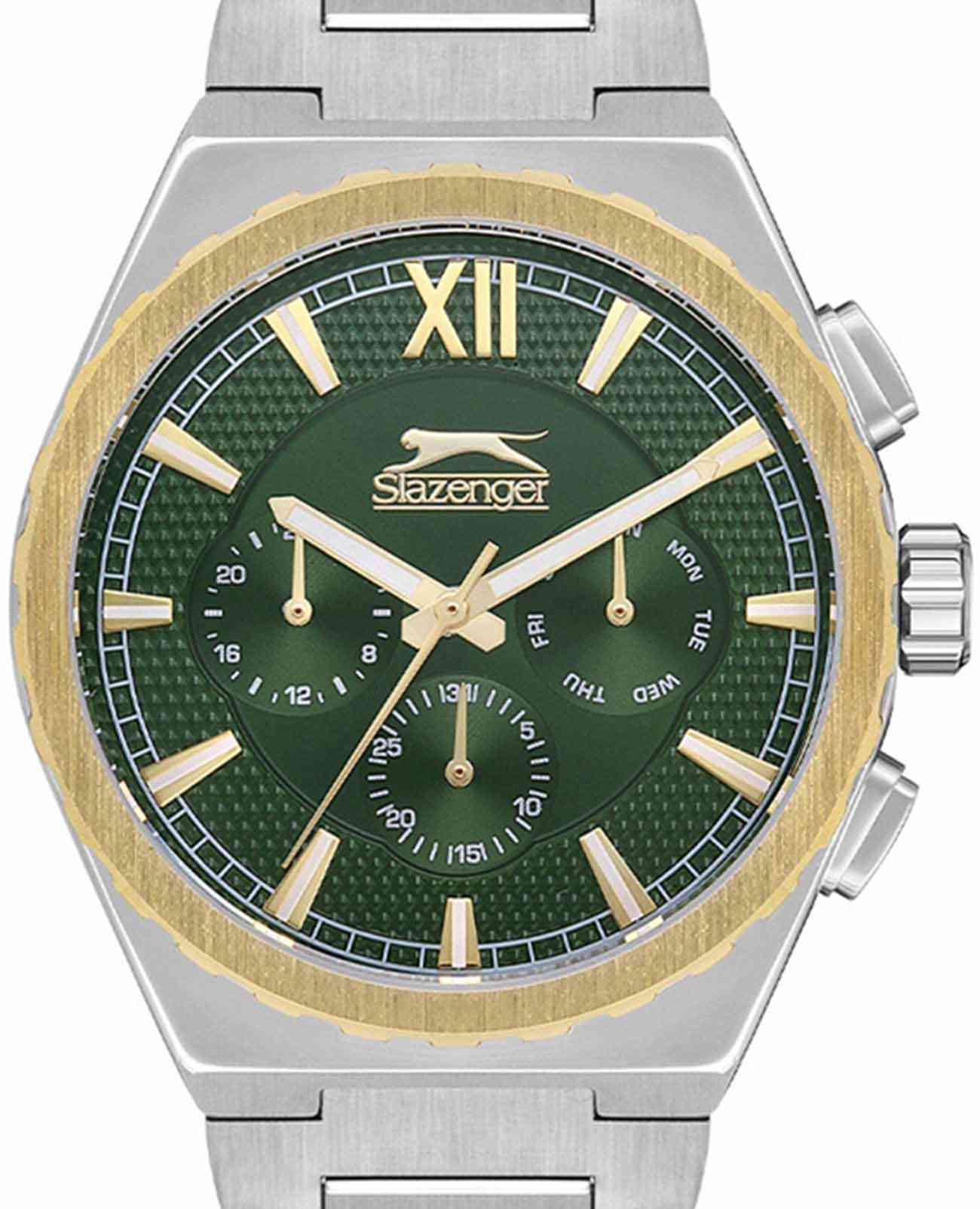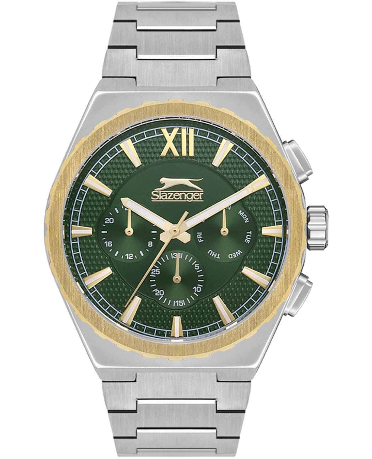 Часы Slazenger SL.09.2128.2.04 воплощают в себе элегантность и практичность, идеально подходящие для современных мужчин. Их зеленый циферблат, защищенный минеральным стекломМинеральное стеклоМинеральное стекло представляет собой искусственно выращенный минерал кварца. Такое стекло отличается особой устойчивостью к повреждениям и царапинам. Уступает по некоторым качествам сапфировому стеклу., заключен в корпус диаметром 46 мм, изготовленный из прочного суперметалла, а безельБезельВнешний ободок, закрепляющий стекло. В спортивных часах так называется поворотное кольцо с делениями на циферблате, выполняет роль таймера – замеряет отрезки времени на шкале. Неподвижный безель – элемент декора. Однонаправленно вращающийся безель на дайверских часах позволяет фиксировать моменты погружения и выныривания на поверхность. этих часов из суперметалла с залотистым IP-покрытиемIP-покрытиеМетод ионного напыления. Демонстрирует повышенную устойчивость к истиранию, окислению и химическим веществам. Под воздействием высокого давления и температуры около 1500°C молекулы металла надёжно соединяются с частицами корпуса часов.. Надежный кварцевый механизм обеспечивает точность, а водозащита 5 ATM делает их устойчивыми к воздействию воды. Стальной браслет из суперметалла с раскладной застёжкойРаскладная застёжкаТакой тип застёжки используется только на браслетах из металла. Она никогда не раскрывается полностью, происходит разделение на 2 и более частей. Раскладывающая застёжка снизит вероятность потери часов к минимуму. подчеркивает современный стиль и комфортно сидит на запястье. Часы оснащены 24-часовым указателем времени, а также функциями отображения даты и дня недели. Люминесцентное покрытиеЛюминесцентное покрытиеПозволяет считывать показания времени в темноте. Производители наносят на стрелки, часовые индексы, безель или поверхность циферблата светонакопительный состав, дающий холодное свечение. на стрелках и метках обеспечивает отличную видимость в темноте.