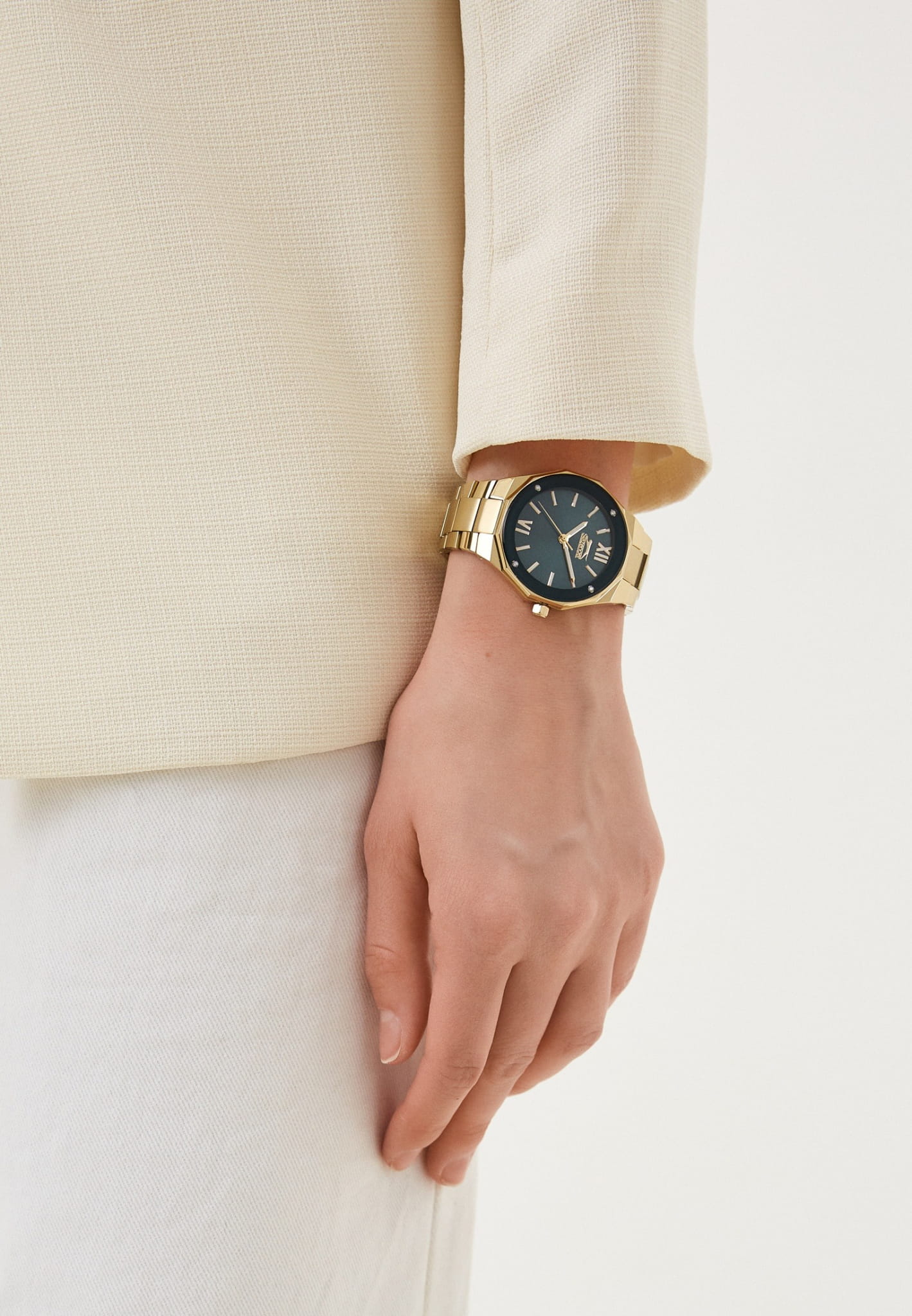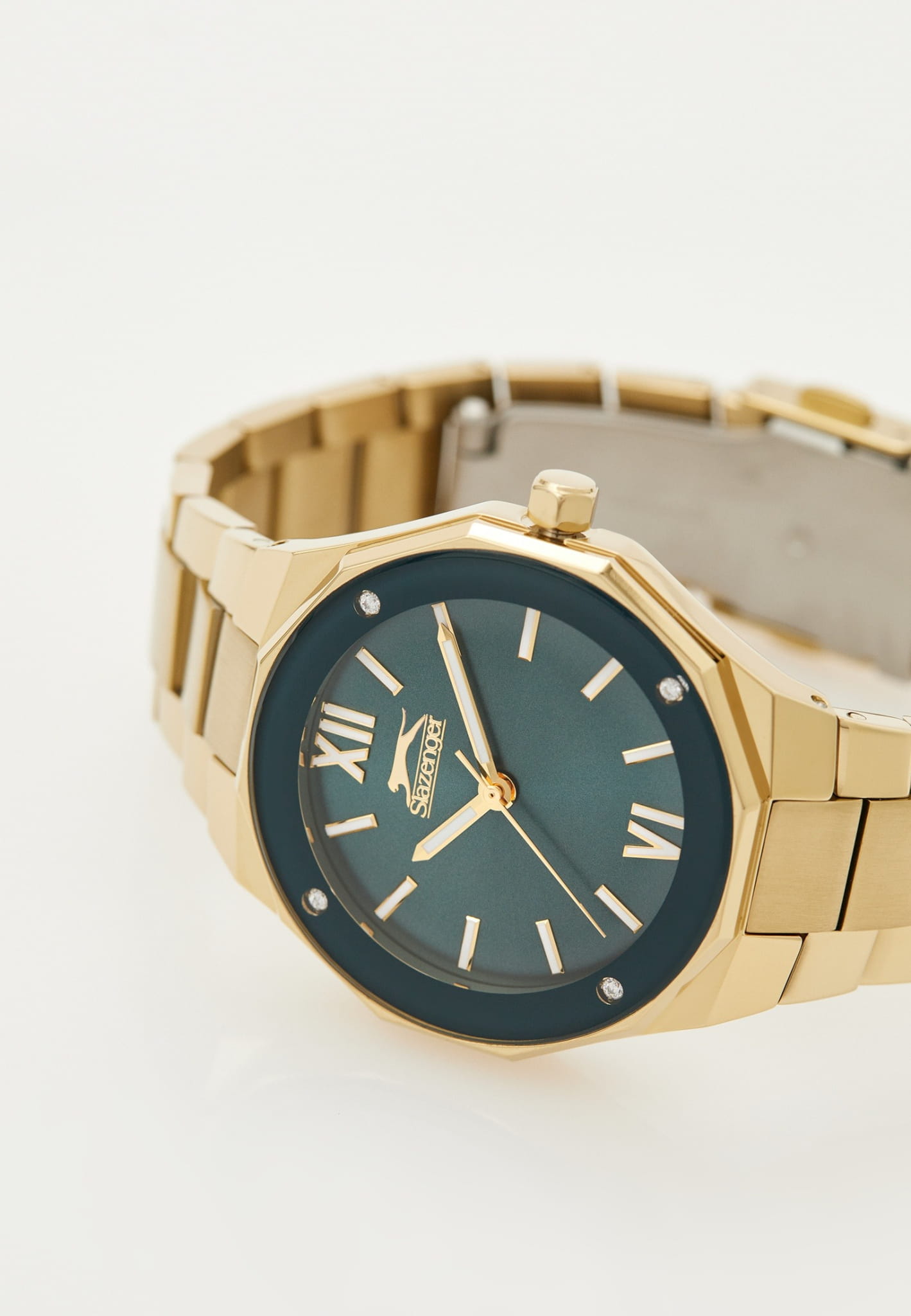 Часы Slazenger SL.09.2258.3.04 — это изысканный аксессуар, который гармонично подчеркнёт ваш индивидуальный стиль. Корпус и браслет выполнены из инновационного суперметалла с золотистым IP-покрытиемIP-покрытиеМетод ионного напыления. Демонстрирует повышенную устойчивость к истиранию, окислению и химическим веществам. Под воздействием высокого давления и температуры около 1500°C молекулы металла надёжно соединяются с частицами корпуса часов. — сплава на основе меди с пониженным содержанием цинка и никеля, обладающего специальным защитным покрытием, а циферблат украшен 4 кристаллами. Надёжный кварцевый механизм обеспечивает точный ход, а прочное минеральное стеклоМинеральное стеклоМинеральное стекло представляет собой искусственно выращенный минерал кварца. Такое стекло отличается особой устойчивостью к повреждениям и царапинам. Уступает по некоторым качествам сапфировому стеклу. устойчиво к царапинам и защищает зеленый циферблат от внешних воздействий. Диаметр корпуса составляет 38 мм, толщина — всего 8 мм, что делает модель элегантной и удобной для ежедневного ношения. Водонепроницаемость до 3 бар позволяет не беспокоиться о случайных брызгах или каплях дождя. Стрелки с люминесцентным покрытиемЛюминесцентное покрытиеПозволяет считывать показания времени в темноте. Производители наносят на стрелки, часовые индексы, безель или поверхность циферблата светонакопительный состав, дающий холодное свечение. удобно подсвечиваются в темноте после зарядки на свету. Стальной браслет с золотистым IP-покрытиемIP-покрытиеМетод ионного напыления. Демонстрирует повышенную устойчивость к истиранию, окислению и химическим веществам. Под воздействием высокого давления и температуры около 1500°C молекулы металла надёжно соединяются с частицами корпуса часов. и раскладной застёжкойРаскладная застёжкаТакой тип застёжки используется только на браслетах из металла. Она никогда не раскрывается полностью, происходит разделение на 2 и более частей. Раскладывающая застёжка снизит вероятность потери часов к минимуму. обеспечивает комфортную посадку. Часы станут отличным выбором как для повседневной жизни, так и для особых случаев, а также послужат прекрасным подарком на любой праздник.