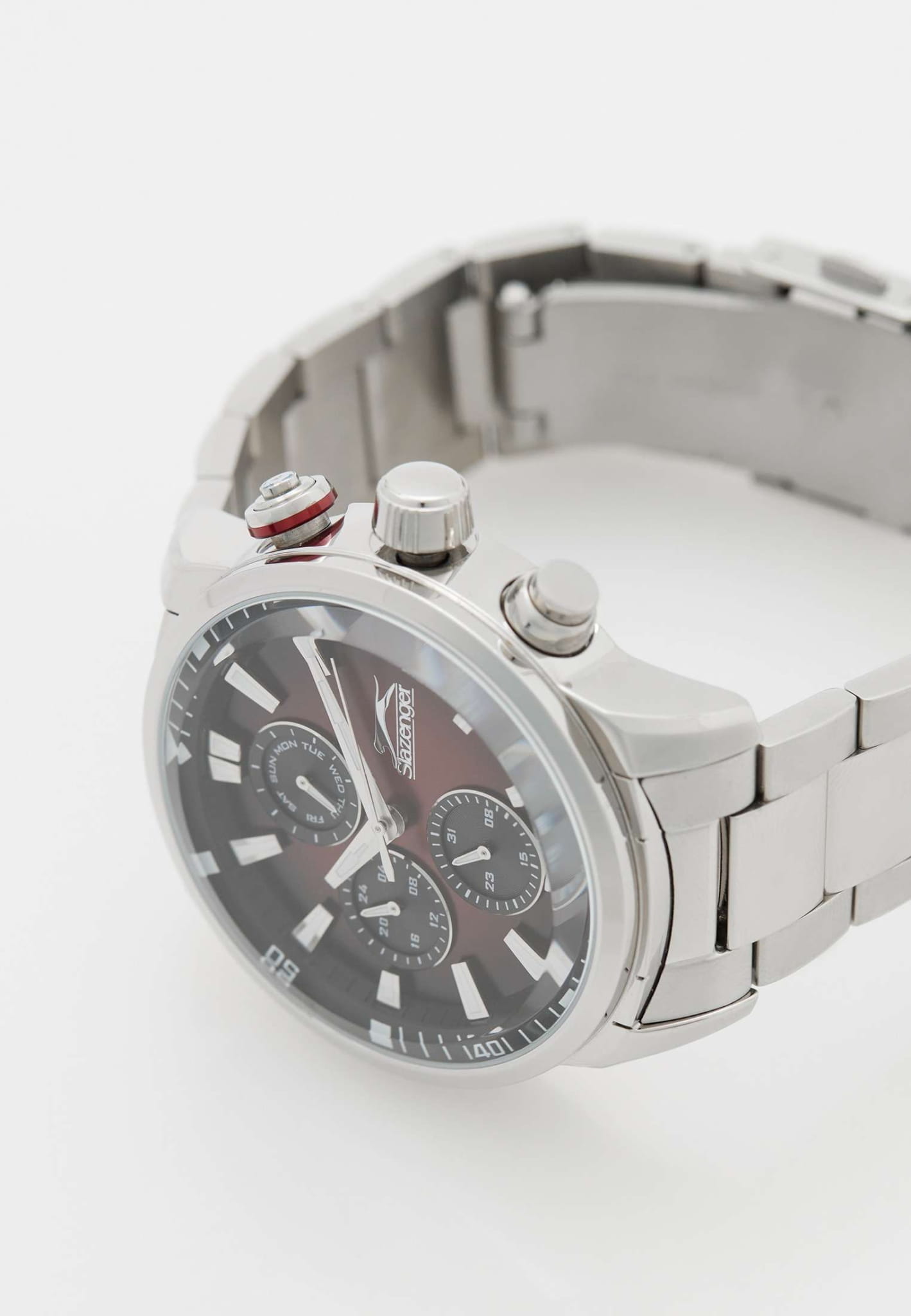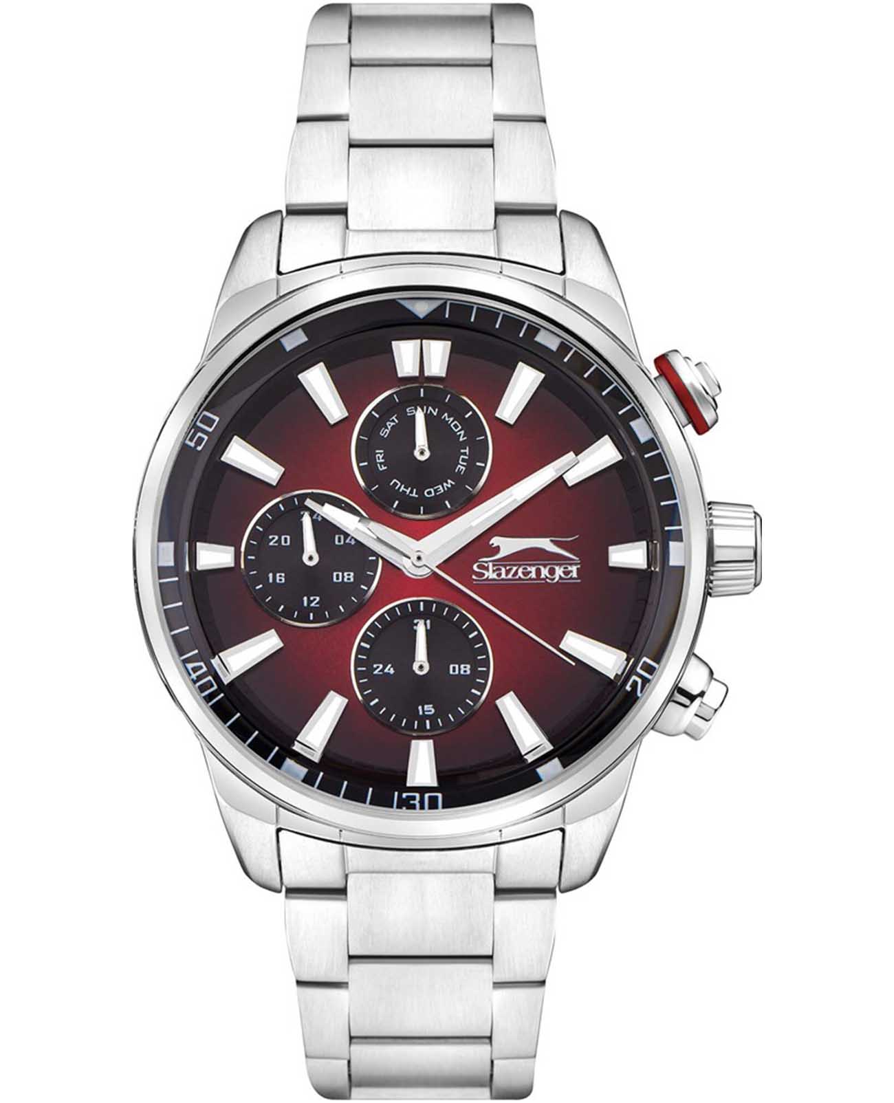 Часы Slazenger SL.09.2272.2.06 – это стильный аксессуар, сочетающий в себе современный дизайн и продуманную функциональность. Модель оснащена точным кварцевым механизмом, который гарантирует стабильную работу и легкость в использовании. Корпус и браслет выполнены из суперметалла — инновационного сплава на основе меди с пониженным содержанием цинка и никеля, обладающего высокой прочностью и устойчивостью к износу благодаря особой технологии покрытия. Элегантный градиентный красно-чёрный циферблат защищён надёжным минеральным стекломМинеральное стеклоМинеральное стекло представляет собой искусственно выращенный минерал кварца. Такое стекло отличается особой устойчивостью к повреждениям и царапинам. Уступает по некоторым качествам сапфировому стеклу., устойчивым к царапинам и повреждениям. На циферблате размещены отдельные индикаторы: 24-часовой указатель времени, а также дополнительные циферблаты для отображения даты и дня недели, что делает модель максимально информативной и удобной в повседневном использовании. Водозащита 5 АТМ (5 бар) надёжно защищает механизм от брызг и дождя, а диаметр корпуса 45 мм и толщина 13 мм обеспечивают солидный внешний вид и комфортную посадку на запястье. Стальной браслет с раскладной застёжкойРаскладная застёжкаТакой тип застёжки используется только на браслетах из металла. Она никогда не раскрывается полностью, происходит разделение на 2 и более частей. Раскладывающая застёжка снизит вероятность потери часов к минимуму. обеспечивает комфортную посадку. Стрелки с люминесцентным покрытиемЛюминесцентное покрытиеПозволяет считывать показания времени в темноте. Производители наносят на стрелки, часовые индексы, безель или поверхность циферблата светонакопительный состав, дающий холодное свечение. удобно подсвечиваются в темноте после зарядки на свету. Часы подойдут как для ежедневного ношения, так и для особых случаев, а универсальный дизайн подчеркнёт индивидуальность и вкус владельца.