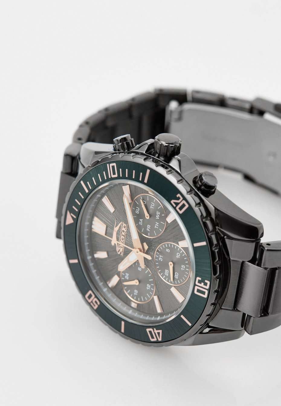 Часы Slazenger SL.09.2273.2.03 – стильный и функциональный аксессуар, который станет достойным дополнением к вашему образу. Модель оснащена надежным кварцевым механизмом, заключенным в корпус из инновационного суперметалла с черным  IP-покрытиемIP-покрытиеМетод ионного напыления. Демонстрирует повышенную устойчивость к истиранию, окислению и химическим веществам. Под воздействием высокого давления и температуры около 1500°C молекулы металла надёжно соединяются с частицами корпуса часов. – прочного сплава на основе меди с пониженным содержанием цинка и никеля и специальным покрытием, устойчивым к износу. На безельБезельВнешний ободок, закрепляющий стекло. В спортивных часах так называется поворотное кольцо с делениями на циферблате, выполняет роль таймера – замеряет отрезки времени на шкале. Неподвижный безель – элемент декора. Однонаправленно вращающийся безель на дайверских часах позволяет фиксировать моменты погружения и выныривания на поверхность. нанесено зеленое IP-покрытиеIP-покрытиеМетод ионного напыления. Демонстрирует повышенную устойчивость к истиранию, окислению и химическим веществам. Под воздействием высокого давления и температуры около 1500°C молекулы металла надёжно соединяются с частицами корпуса часов., что придает аксессуару утончённый и универсальный внешний вид. Чёрный циферблат под минеральным стекломМинеральное стеклоМинеральное стекло представляет собой искусственно выращенный минерал кварца. Такое стекло отличается особой устойчивостью к повреждениям и царапинам. Уступает по некоторым качествам сапфировому стеклу. дополнен отдельными счетчиками: 24-часовой указатель времени, индикаторы даты и дня недели. Диаметр корпуса составляет 44 мм, а толщина – 12 мм, что обеспечивает комфортную посадку на запястье и подчёркивает современный стиль часов. Браслет из суперметалла с IP-покрытиемIP-покрытиеМетод ионного напыления. Демонстрирует повышенную устойчивость к истиранию, окислению и химическим веществам. Под воздействием высокого давления и температуры около 1500°C молекулы металла надёжно соединяются с частицами корпуса часов. и с раскладной застёжкойРаскладная застёжкаТакой тип застёжки используется только на браслетах из металла. Она никогда не раскрывается полностью, происходит разделение на 2 и более частей. Раскладывающая застёжка снизит вероятность потери часов к минимуму. обеспечивает комфортную посадку. Стрелки и метки с люминесцентным покрытиемЛюминесцентное покрытиеПозволяет считывать показания времени в темноте. Производители наносят на стрелки, часовые индексы, безель или поверхность циферблата светонакопительный состав, дающий холодное свечение. удобно подсвечиваются в темноте после зарядки на свету. Водонепроницаемость 5 АТМ защищает механизм от брызг и дождя, позволяя не беспокоиться о сохранности аксессуара в повседневной жизни. Эта модель станет отличным выбором для ежедневного ношения или особых случаев и прекрасным подарком для мужчины к любому празднику.