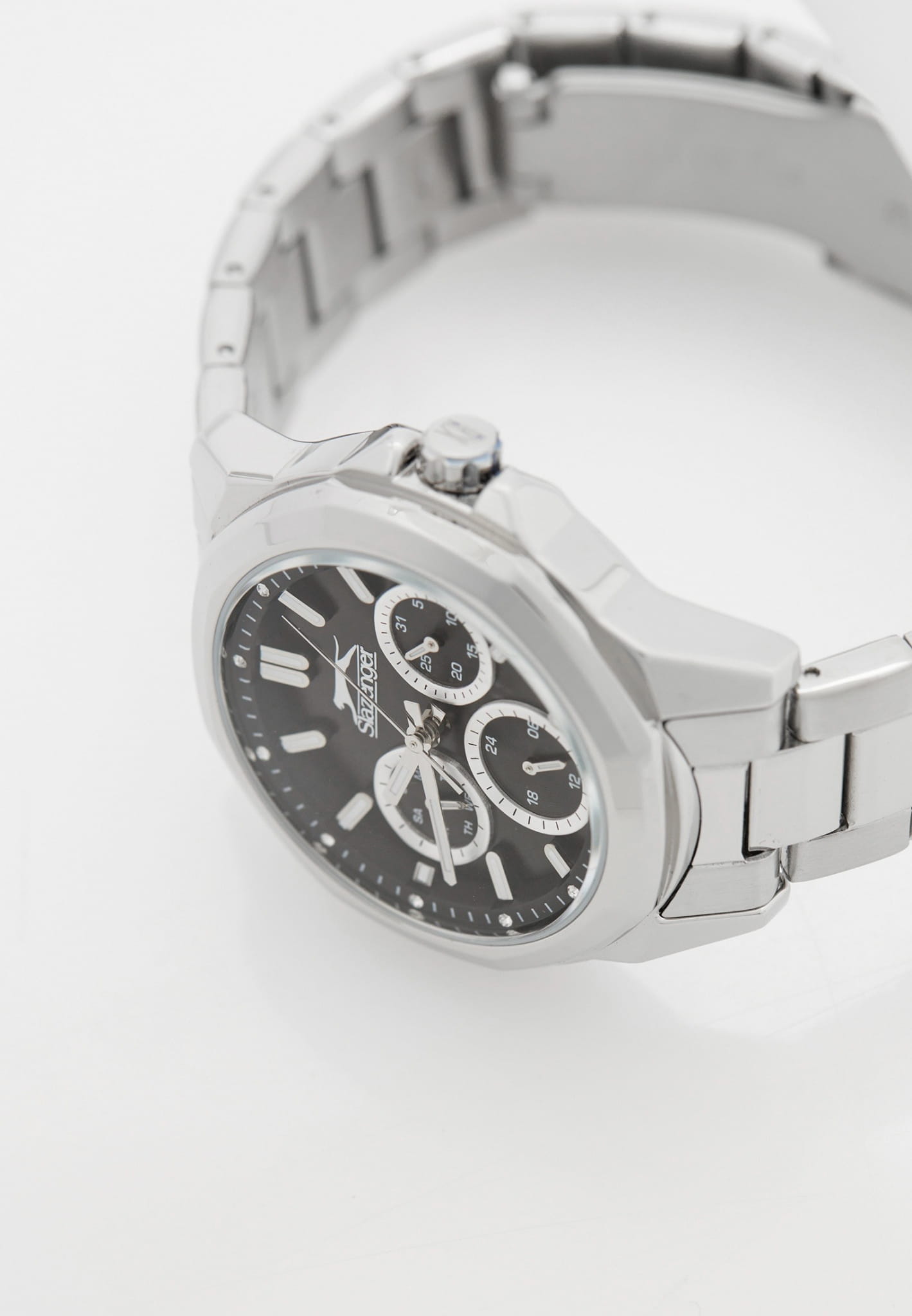 Часы Slazenger SL.09.2290.4.01 — это сочетание современного дизайна и функциональности, идеально подходящее для тех, кто ценит стиль и элегантность. Корпус и браслет выполнены из прочного суперметалла, что придаёт модели солидный и эффектный вид. Черный циферблат с лаконичными отметками, кристаллами и фирменным логотипом защищён устойчивым к царапинам минеральным стекломМинеральное стеклоМинеральное стекло представляет собой искусственно выращенный минерал кварца. Такое стекло отличается особой устойчивостью к повреждениям и царапинам. Уступает по некоторым качествам сапфировому стеклу.. Дополнительные функции включают отображение даты и дня недели, а также 12- и 24-часовой формат времени на отдельных мини-циферблатах, что делает использование часов максимально удобным. Заводная головка оснащена защитой, а надёжная раскладная застёжкаРаскладная застёжкаТакой тип застёжки используется только на браслетах из металла. Она никогда не раскрывается полностью, происходит разделение на 2 и более частей. Раскладывающая застёжка снизит вероятность потери часов к минимуму. обеспечивает комфортную посадку на запястье. Особое внимание привлекает восьмигранный безельБезельВнешний ободок, закрепляющий стекло. В спортивных часах так называется поворотное кольцо с делениями на циферблате, выполняет роль таймера – замеряет отрезки времени на шкале. Неподвижный безель – элемент декора. Однонаправленно вращающийся безель на дайверских часах позволяет фиксировать моменты погружения и выныривания на поверхность.. Циферблат оснащён люминесцентным покрытиемЛюминесцентное покрытиеПозволяет считывать показания времени в темноте. Производители наносят на стрелки, часовые индексы, безель или поверхность циферблата светонакопительный состав, дающий холодное свечение. стрелок и меток, что позволяет легко определять время даже в условиях плохой освещенности. Водозащита 30WR позволяет не беспокоиться о случайных брызгах и дождевых каплях. Диаметр корпуса составляет 36 мм, толщина — 12 мм, вес — 97 г, благодаря чему часы выглядят внушительно и подчёркивают индивидуальный стиль владельца. Эта модель станет отличным акцентом в вашем образе и подчеркнёт вашу уверенность в любой ситуации.