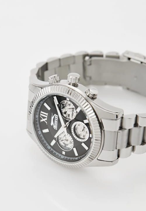 Мужские кварцевые часы Slazenger SL.09.2316.2.02 - это выразительный и функциональный аксессуар, сочетающий прочность, стиль и насыщенную комплектацию. Корпус и браслет выполнены из суперметалла. Циферблат чёрного цвета защищён минеральным стекломМинеральное стеклоМинеральное стекло представляет собой искусственно выращенный минерал кварца. Такое стекло отличается особой устойчивостью к повреждениям и царапинам. Уступает по некоторым качествам сапфировому стеклу. и оформлен с вынесенными малыми циферблатами для индикации дня недели, даты и времени в 24-часовом формате. Стрелки и метки оснащены люминесцентным покрытиемЛюминесцентное покрытиеПозволяет считывать показания времени в темноте. Производители наносят на стрелки, часовые индексы, безель или поверхность циферблата светонакопительный состав, дающий холодное свечение., обеспечивающим хорошую читаемость в темноте. Завинчивающаяся задняя крышка повышает надёжность конструкции. Браслет из суперметалла фиксируется на раскладной застёжкеРаскладная застёжкаТакой тип застёжки используется только на браслетах из металла. Она никогда не раскрывается полностью, происходит разделение на 2 и более частей. Раскладывающая застёжка снизит вероятность потери часов к минимуму., обеспечивая удобство и безопасность ношения. Водонепроницаемость 50 м позволяет использовать часы в повседневных условиях, защищая от случайных брызг и капель дождя. Модель подчёркивает индивидуальность владельца и идеально подходит как для повседневного, так и для делового образа.