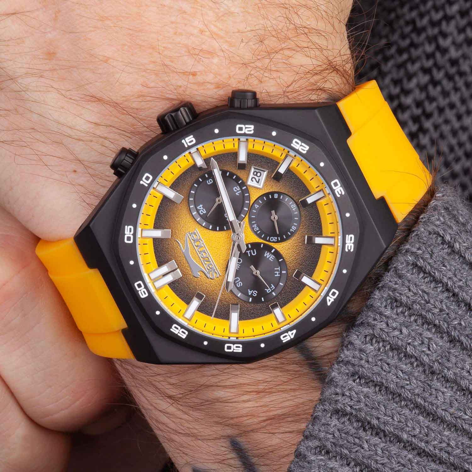 Мужские элегантные наручные часы Slazenger SL.09.2341.2.04 сочетают в себе современный стиль и функциональность. Стильный корпус выполнен из нержавеющей стали с IP-покрытиемIP-покрытиеМетод ионного напыления. Демонстрирует повышенную устойчивость к истиранию, окислению и химическим веществам. Под воздействием высокого давления и температуры около 1500°C молекулы металла надёжно соединяются с частицами корпуса часов., придающий модели дополнительную прочность и элегантный внешний вид. Изысканный циферблат защищён минеральным стекломМинеральное стеклоМинеральное стекло представляет собой искусственно выращенный минерал кварца. Такое стекло отличается особой устойчивостью к повреждениям и царапинам. Уступает по некоторым качествам сапфировому стеклу., устойчивым к царапинам и повреждениям, и дополнен вынесенными малыми циферблатами для индикации дня недели и времени в 24-часовом формате. Водонепроницаемость 5 АТМ позволяет использовать часы в повседневных условиях — при мытье рук или под лёгким дождём. Ремень из силикона со стандартной застежкой, обеспечивающий надёжную фиксацию и комфорт при ношении. Окошко даты находится в положении между 4 и 5 часами. Cтрелки и метки покрыты люминесцентным покрытиемЛюминесцентное покрытиеПозволяет считывать показания времени в темноте. Производители наносят на стрелки, часовые индексы, безель или поверхность циферблата светонакопительный состав, дающий холодное свечение. для читаемости в условиях недостаточного освещения. Эта модель идеально подходит для мужчин, ценящих стиль, функциональность и надёжность в одном аксессуаре.