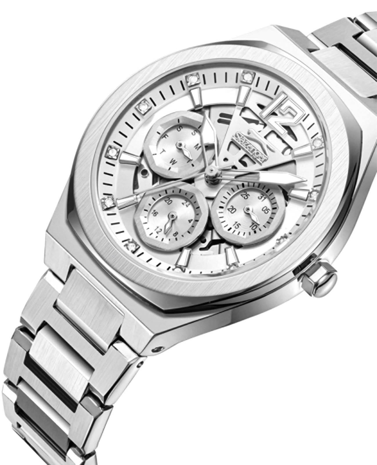 Женские кварцевые часы Slazenger — это элегантный и функциональный аксессуар. Корпус диаметром 36 мм и толщиной 11 мм выполнен из суперметалла. Циферблат серебристого цвета частично скелетонизирован и украшен фианитами. Циферблат защищён минеральным стекломМинеральное стеклоМинеральное стекло представляет собой искусственно выращенный минерал кварца. Такое стекло отличается особой устойчивостью к повреждениям и царапинам. Уступает по некоторым качествам сапфировому стеклу.. Механизм — кварцевый калибр VX3JE1. Часы оснащены индикацией дня недели, даты и 12/24-часового формата времени. Часы оснащены браслетом из суперметалла с раскладной застёжкойРаскладная застёжкаТакой тип застёжки используется только на браслетах из металла. Она никогда не раскрывается полностью, происходит разделение на 2 и более частей. Раскладывающая застёжка снизит вероятность потери часов к минимуму.. Водонепроницаемость 50 м позволяет использовать часы в повседневных условиях. Гарантия — 12 месяцев. Идеальный выбор для тех, кто ценит стиль, функциональность и качество.