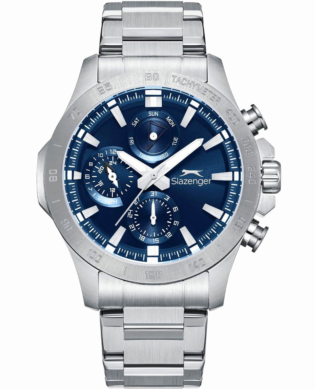 Мужские кварцевые часы Slazenger — это выразительный и функциональный аксессуар. Корпус диаметром 44 мм и толщиной 12 мм выполнен из нержавеющей стали 316L. Циферблат синего цвета оформлен индексами и стрелками. Циферблат защищён минеральным стекломМинеральное стеклоМинеральное стекло представляет собой искусственно выращенный минерал кварца. Такое стекло отличается особой устойчивостью к повреждениям и царапинам. Уступает по некоторым качествам сапфировому стеклу.. Механизм — кварцевый. Часы оснащены индикацией дня недели, даты и 12/24-часового формата времени. Стрелки и метки с люминесцентным покрытиемЛюминесцентное покрытиеПозволяет считывать показания времени в темноте. Производители наносят на стрелки, часовые индексы, безель или поверхность циферблата светонакопительный состав, дающий холодное свечение., обеспечивающим хорошую читаемость в темноте. Часы оснащены стальным браслетом с раскладной застёжкойРаскладная застёжкаТакой тип застёжки используется только на браслетах из металла. Она никогда не раскрывается полностью, происходит разделение на 2 и более частей. Раскладывающая застёжка снизит вероятность потери часов к минимуму.. Водонепроницаемость 100 м позволяет использовать часы для плавания и повседневного ношения. Гарантия — 12 месяцев. Идеальный выбор для тех, кто ценит стиль, функциональность и качество.