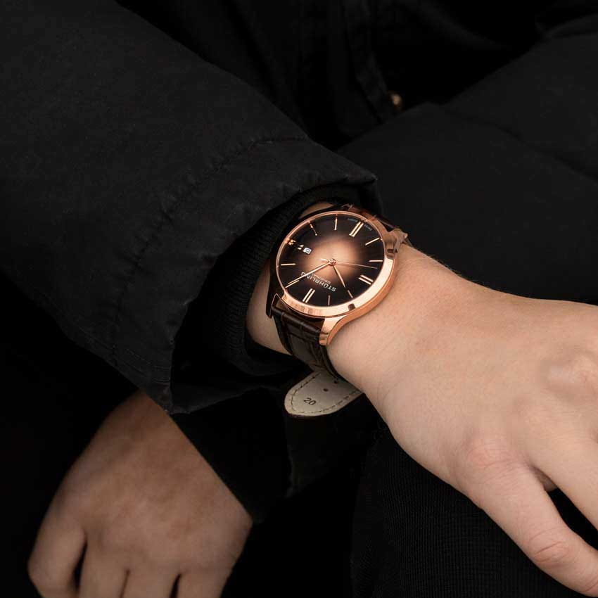 Stuhrling 4014.3 — элегантные мужские часы, объединяющие строгую классику и современную функциональность. Корпус из нержавеющей стали с PVD-покрытиемPVDУльтратонкое покрытие наносится в технике вакуумного напыления, сочетает в себе нитрид титана особой прочности со слоем золота или оксида хрома. Несёт в себе декоративную или защитную функцию. создают ощущение монолитной надёжности, а глубокий циферблат с вертикальной текстурой придаёт модели выразительность и характер. Кожаный ремешок на стандартной застежке обеспечивает комфорт. Крупные метки и стрелки обеспечивают идеальную читаемость. На позиции «3 часов» расположено аккуратное окно даты, подчёркивающее симметрию дизайна. Прочное стекло Krysterna защищает циферблат от царапин, а надёжный кварцевый механизм гарантирует стабильную точность. Stuhrling — выбор уверенного мужчины, ценящего сочетание функциональности, лаконичного дизайна и безупречной отделки.